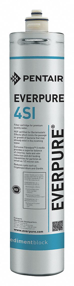 Quick Connect Filter, For Use With Filtration System, Reduces Scale, Micron Rating 0.5 micron, Flow Rate 2 gpm, Diameter 3 1/4 in, Overall Height 14 1/2 in, Service Life 15,000 gal, Filter Media Mechanical Filtration, Polyphosphate, Maximum Temperature 100 Degrees F, Application Ice Maker, Standards NSF 42, NSF 53, Series 4SI, Compatible Mfr. Model Number EV925924-75, EV927222-75, EV927241-75, Compatible with Grainger Part Number 5WFG6, 5WFG8, 5WFJ1, Maximum Pressure 125 psi This EVERPURE filter cartridge uses depth filtration and Fibredyne(TM) media for superior dirt holding capability. Helps prevent scale buildup that can clog distribution lines, cause probe, float, pump, solenoid, and valve malfunctions, and higher energy consumption. Model leaves chlorine and chloramines within water t