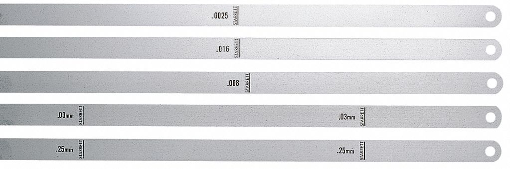 Feeler Gauge, Blade Length 12 in, Blade Material Steel, Blade Style Long Blade, Blade Width 1/2 in, Dimension Type Inch, Non-Magnetic No, Thickness 0.0005 in, Finish Unfinished, Markings Inch Feeler thickness gage includes a steel case. Locknut holds one or more leaves in any position.