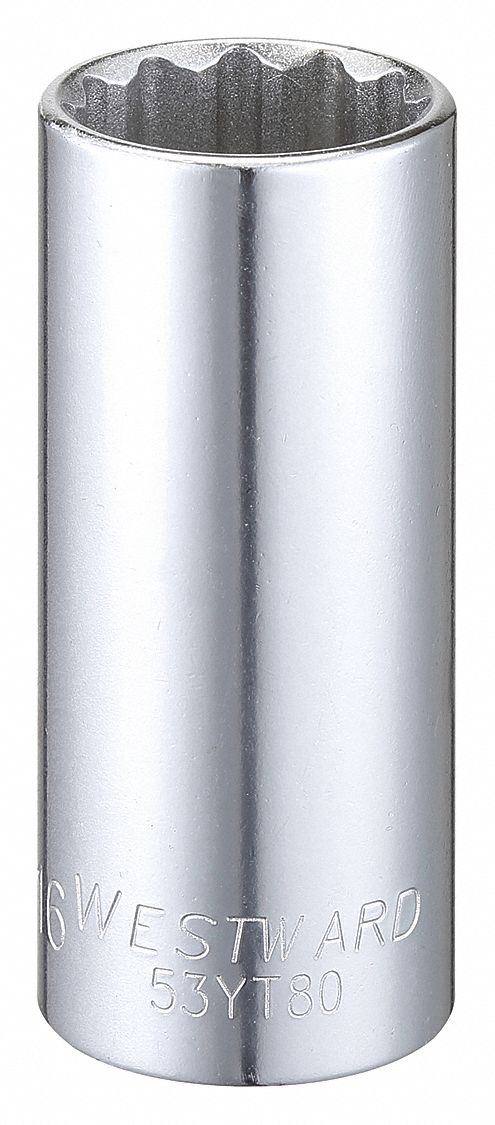 Socket, Socket Size 13/16 in, 12-Point, Alloy Steel, Chrome, Deep, Hand, Drive Size 3/8 in, SAE, Impact Rated No, Bolt Clearance 15.2 mm, Standards ASME B107.110-2012 This industrial-grade mechanic's 8-pt. standard socket is designed for heavy-duty applications and production use. It is made of professional-quality chrome vanadium and fully polished. The 8-pt. design is used for applications that required square nuts or bolts with square heads. They can also be used on square pipe plugs and set screws.