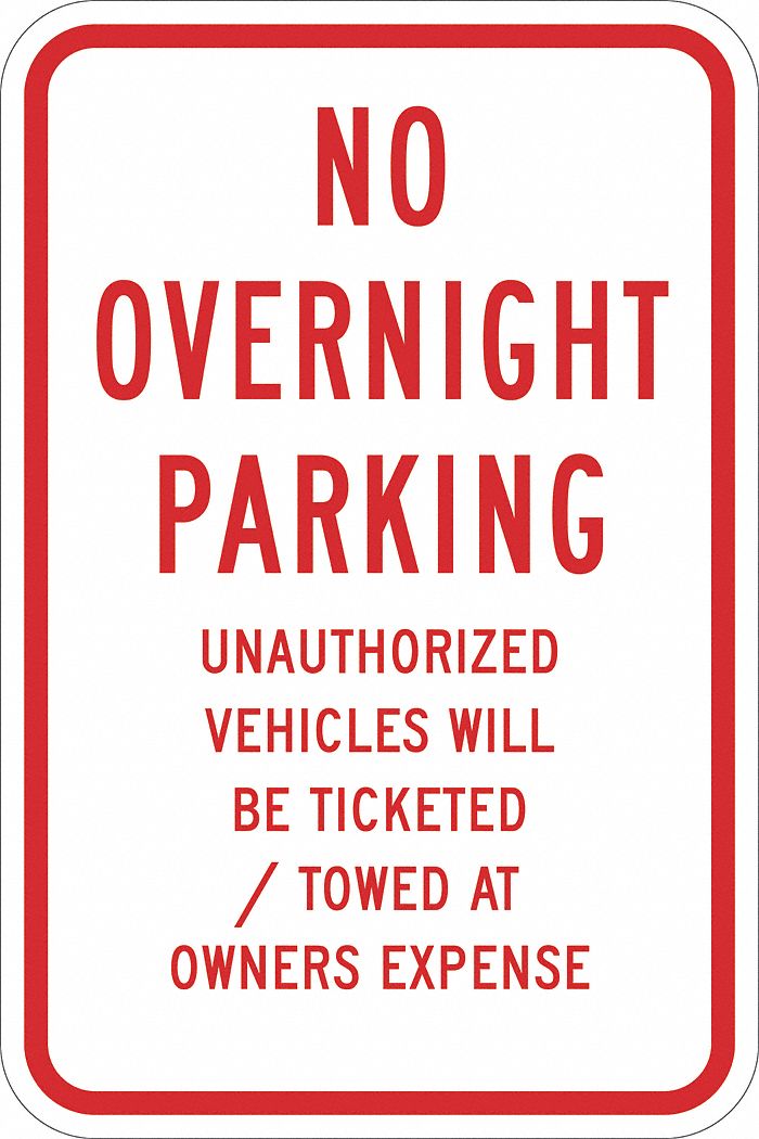 No Overnight Parking Sign, Height 18 in, Width 12 in, Sign Material Aluminum, Sign Mounting Style Mounting Holes, Printed Language English, Sign Shape Vertical Rectangle