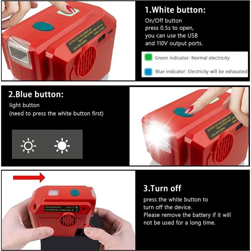 * It needs to press the "white button" first to use the other usb or led function. When the battery power is lower than 16V, the USB and LED light cannot work anymore.