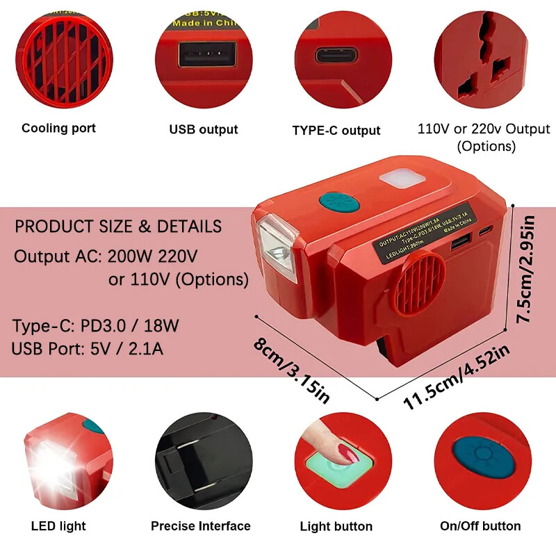 Power Inverter Generator- The 200W modifined sine wave portable power generator has usb & type C ports, led light, DC 18V to AC 110V/220V Outlet for device charging. Modified sine wave is more faster and steady.