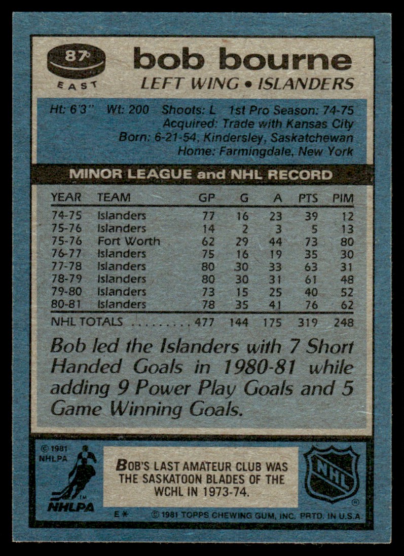 | 1981-82 Topps Bob Bourne New York Islanders #E87 | ||||||||||||||||
