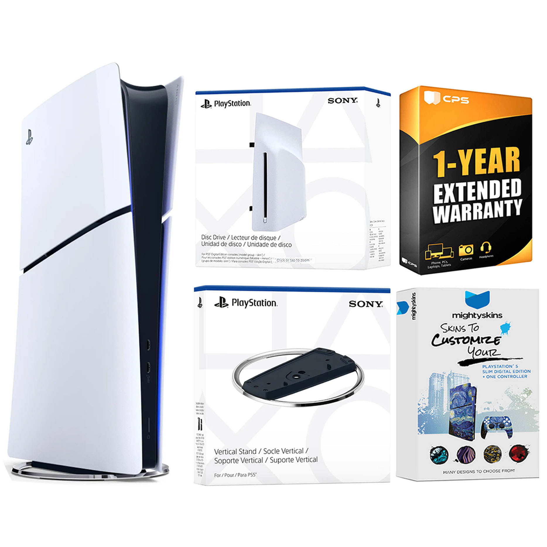 INCLUDED: Sony PlayStation 5 Digital, 1x Controller, Disc Drive Attachment, Vertical Stand, HDMI cable, AC power cord, MightySkins Voucher, and 1 Year Extended CPS Warranty