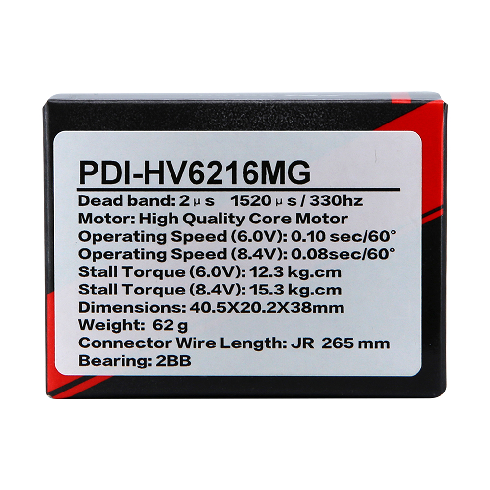 PDI-HV62I6MG Specifications: Dead band: 2μs 1520μs / 330hz Motor: High Quality Core Motor Operating Speed (6.0V): 0.10 sec/60° Operating Speed (8.4V): 0.08sec/60° Stall Torque (6.0V): 12.3 kg.cm Stall Torque (8.4V): 15.3 kg.cm Dimensions: 40.5X20.2X38mm Weight: 62 g Connector Wire Length: JR 265 mm Bearing: 2BB
