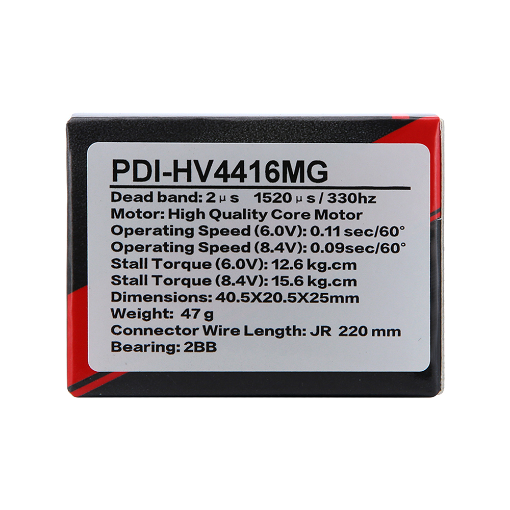 PDI-HV4416MG Specifications: Dead band: 2μs Working frequence:1520μs / 330hz Motor: High Quality Core Motor Voltage Range:6.0-8.4V Operating Speed (6.0V): 0.11 sec/60° Operating Speed (8.4V): 0.09sec/60° Stall Torque (6.0V): 12.6 kg.cm Stall Torque (8.4V): 15.6 kg.cm Dimensions: 40.5X20.5X28mm Weight: 47 g Connector Wire Length: JR 220 mm Bearing: 2BB