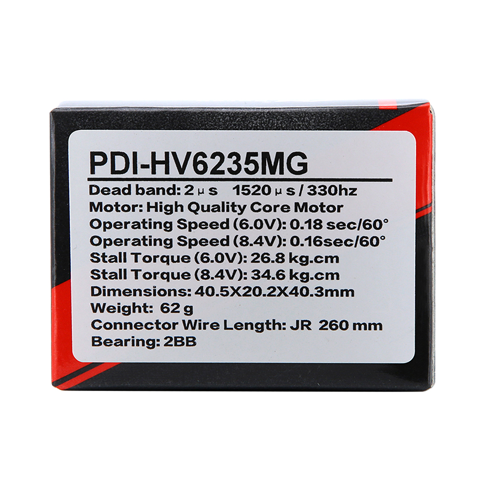 PDI-HV6235MG Specifications: Dead band: 2μs Working frequence:1520μs / 330hz Motor: High Quality Core Motor Voltage Range:6.0-8.4V Operating Speed (6.0V): 0.18 sec/60° Operating Speed (8.4V): 0.16sec/60° Stall Torque (6.0V): 26.8 kg.cm Stall Torque (8.4V): 34.6 kg.cm Dimensions: 40.5X20.2X40.3mm Weight: 62 g Connector Wire Length: JR 260 mm Bearing: 2BB