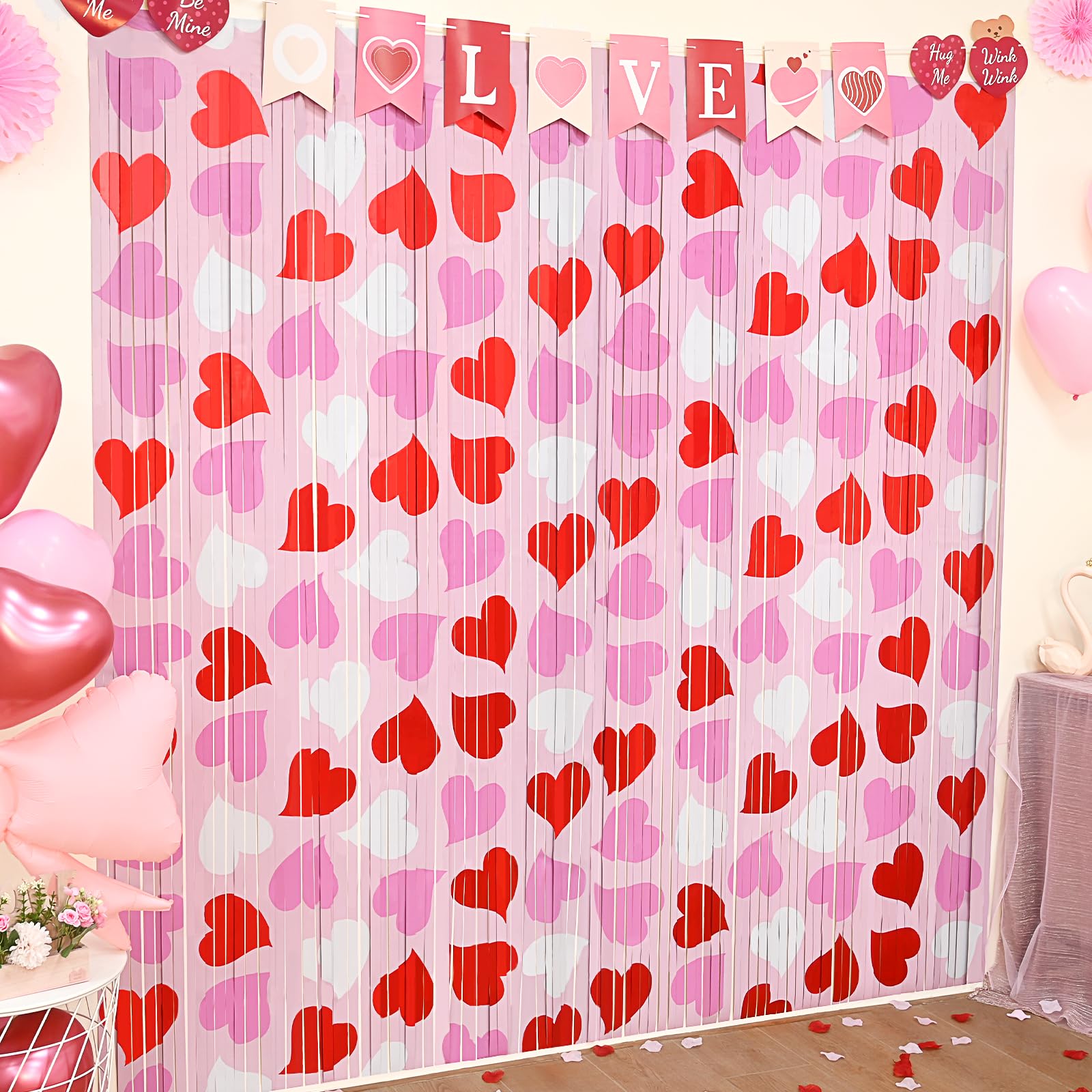 - πγ UNIQUE & ROMANTIC PARTY BACKDROP γοΌ Our elegant red pink white heart pattern tinsel foil fringe curtains are the perfect photo backdrop for Valentine's Day, Engagement, Wedding, Bridal Shower, Birthday, Bachelorette party decorations, you will be amazed at the romantic atmosphere and view they create.