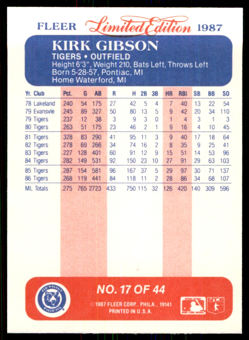 | Description: | Kirk Gibson | | Category: | Baseball | | Year: | 1987 | | Product: | Fleer Limited Edition | | Team: | Detroit Tigers | | Card Number: | 17 | | Dimensions: | 3½" x 2½" |