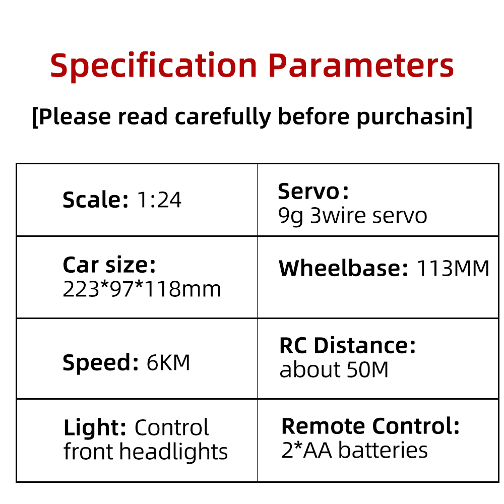 2WD Specifications: Scale: 1:24 Speed: 6KM Light: Control front headlights Servo: 9g 3wire servo ESC: 2.4GHZ brushed ESC(9A) Wheelbase: 113MM Motor: 130S motor Battery: 500mAh 3.7V RC Distance: about 50M Use time: About 50min Remote Control: 2*AA batteries
