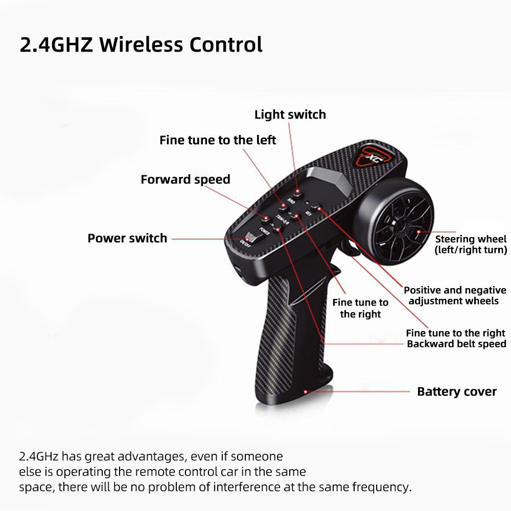 Features: 1. fully automatic design controllable headlights. 2. Full proportional throttle/steering. 3. 2.4GHz remote control, there will be no problem of interference at the same frequency. 4. Luggage rack design that can carry to metal oil drums and other accessories. 5. Rear staircase design, giving you a more authentic car experience. 6. All-terrain rubber tires with strong groundadhesion and friction resistance.
