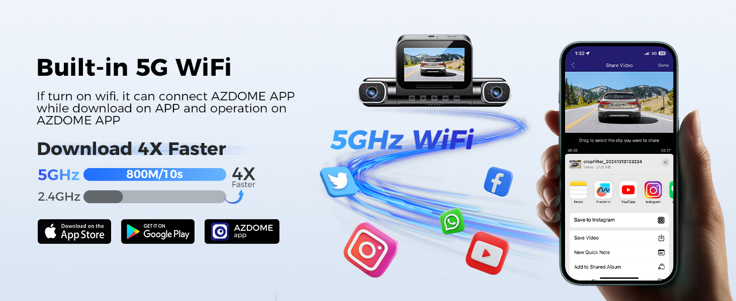 5G WiFi-Hochgeschwindigkeitszugang und GPS:Erleben Sie Download-Geschwindigkeiten, die bis zu viermal schneller sind als 2.4G WiFi mit der M660 4-Kanal Dashcam, die es Nutzern ermöglicht, ein 800MB Video in nur 13 Sekunden herunterzuladen. Greifen Sie sofort auf alle Inhalte zu, die Sie benötigen, und teilen Sie die schönsten Momente Ihrer Fahrten über die AZDOME APP direkt in den sozialen Medien. Genießen Sie die nahtlose Weitergabe von Abenteuern der Nutzer! Das GPS zeichnet die Position Ihres Fahrzeugs (Längen- und Breitengrad), die Fahrgeschwindigkeit und die Route genau auf. So erhalten Sie einen umfassenden Überblick über Ihre Reise, den Sie ganz einfach über Ihr Smartphone oder Ihren Computer abrufen können.