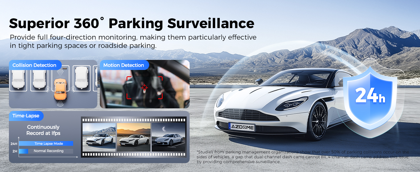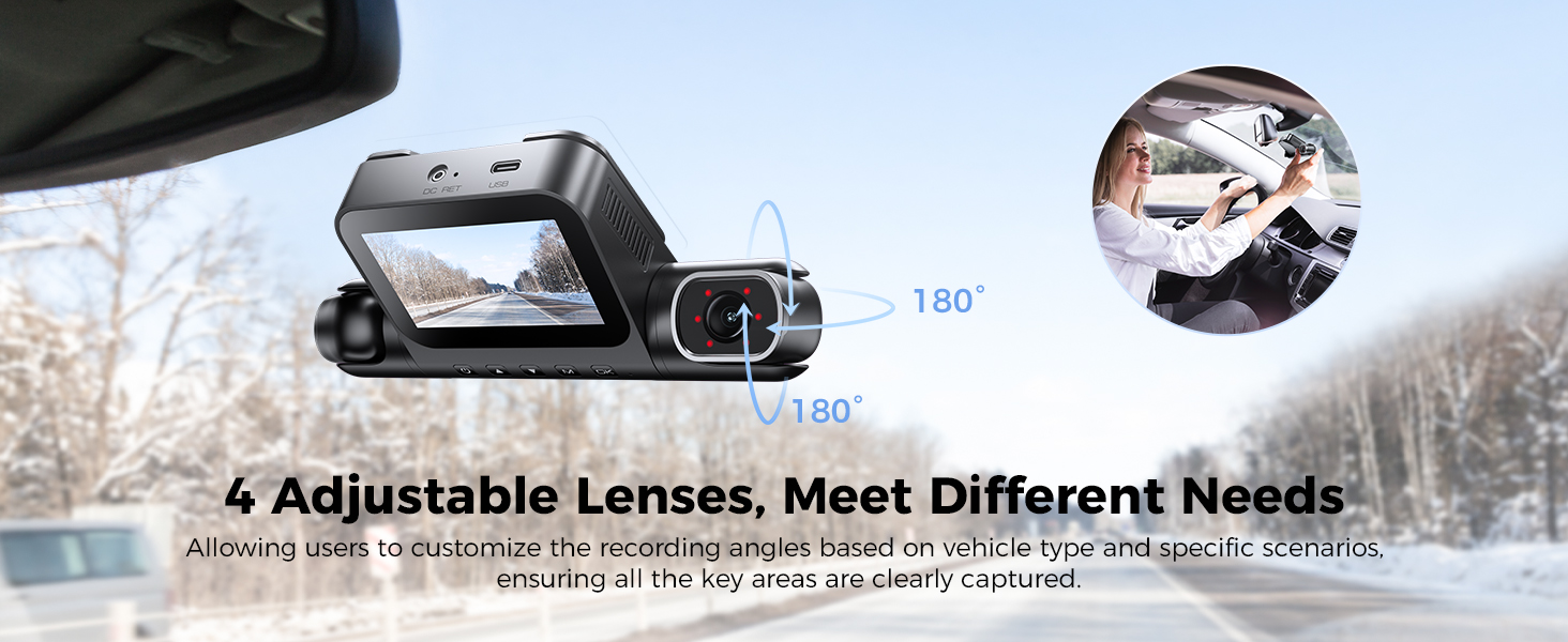 4 einstellbare Linsen: Passen Sie die Aufnahmewinkel an, indem Sie die Richtung der Objektive einstellen. Die M660 360 Dashcam erfasst klare Aufnahmen von vorne, hinten und von beiden Seiten des Fahrzeugs des Fahrers. Die AZDOME Dashcam liefert vollständige Beweise für Vorfälle wie Vandalismus, Diebstahl, Parkkratzer und Versicherungsbetrug und stellt sicher, dass der Fahrer in jeder Situation abgesichert ist.