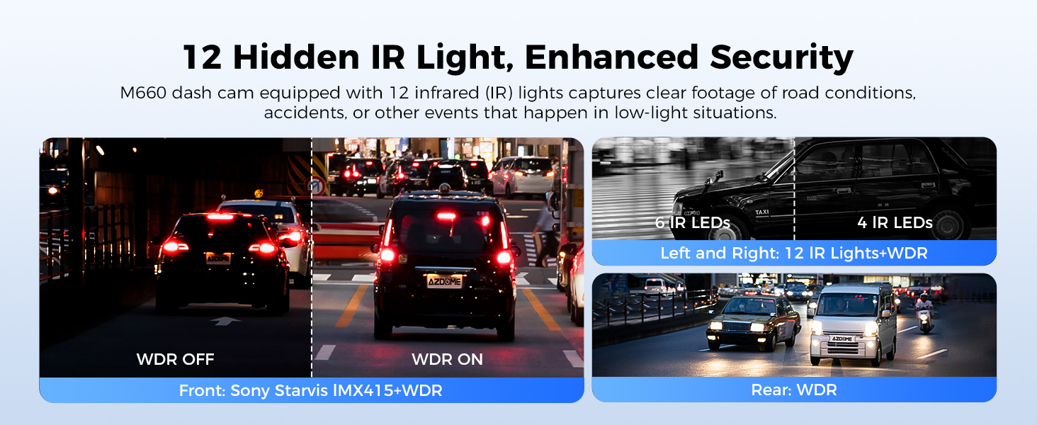 12 IR-Lichter für optimale Leistung bei schlechten Lichtverhältnissen: Die M660-Kameras für die linke und rechte Kabine verfügen über jeweils 6 integrierte IR-LEDs, die die Videoqualität bei Nacht verbessern und eine klare Erfassung aller Aufnahmedetails bei schlechten Lichtverhältnissen gewährleisten.