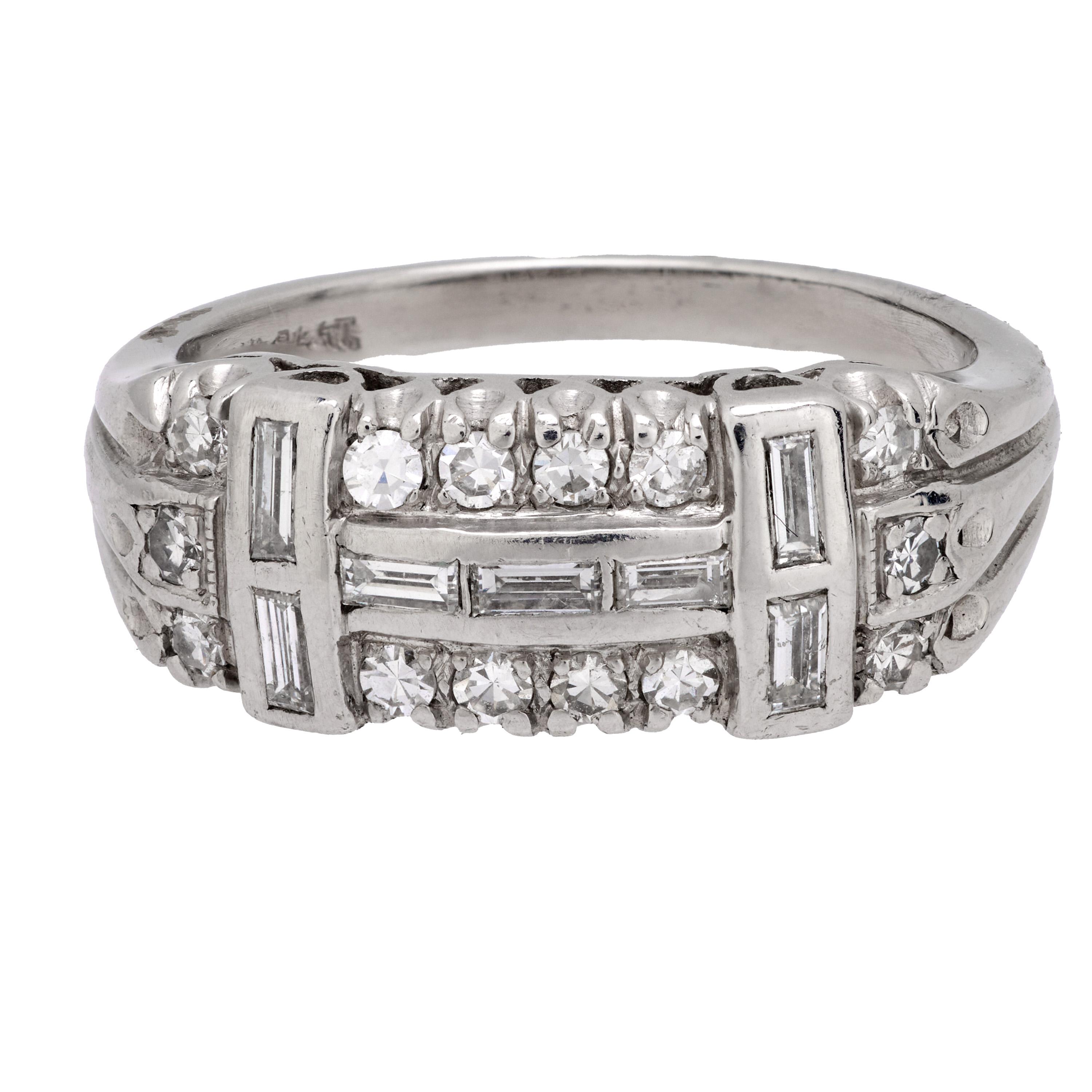 This Art Deco platinum ring showcases twenty-one single and baguette cut diamonds arranged in a crisp, geometric design. Crafted in the 1930s, its bold symmetry and refined sparkle reflect the timeless sophistication of the Deco era.