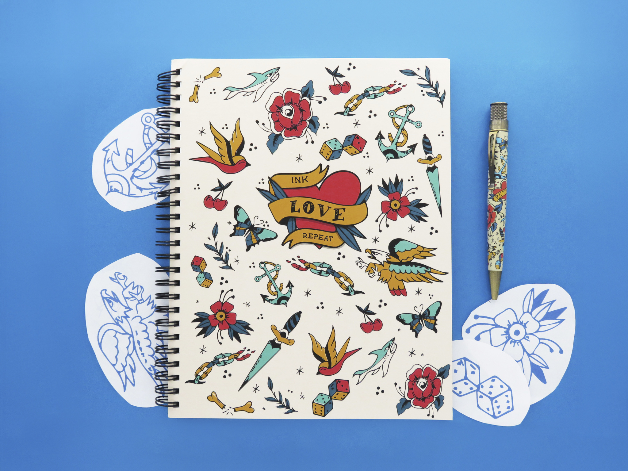This tattoo-inspired spiral sketchbook is packed with bold attitude and classic flair. The cover bursts with bright colors, thick lines, and timeless symbols of luck, love, and rebellion—paying homage to the American Traditional tattoo style that never goes out of fashion. Inside, you'll find smooth, quality pages ready for your boldest doodles, wildest sketches, or everyday notes. Whether you're drawing, journaling, or just daydreaming, this sketchbook is here to bring a flash of flair to your creative flow.