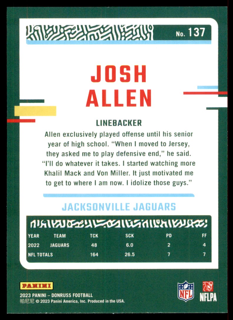 | 2023 Donruss Josh Allen Jacksonville Jaguars #137 |