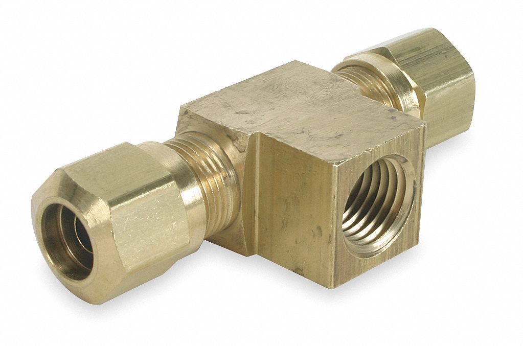 Female Branch Tee, Application Air, Fitting Side A Connection Type Compression, Fitting Side B Connection Type Compression, Fitting Side C Connection Type FNPT, Finish/Coating Nickel-Plated, Fitting Material Brass, Fitting Side A Tube Outer Diameter 3/8 in, Fitting Side B Tube Outer Diameter 3/8 in, Thread Size C 1/4-18, Thread Size A 1/4-18, System of Measurement Imperial, Maximum Operating Pressure 150 psi, Maximum Operating Temperature 200 Degrees F, Overall Length 2 29/32 in