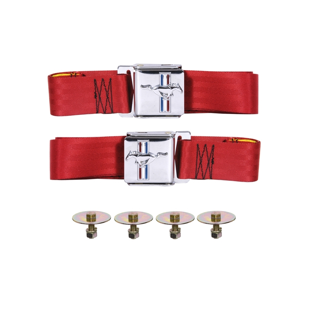 A strong red nylon webbing is used for these lap belts. The buckle is the familiar aircraft style flap and roller accented by the famous running pony on an enameled tri color. Why not upgrade with style? These belts bolt-in in minutes for a clean, classic look. Sold as a pair, fit front or rear.