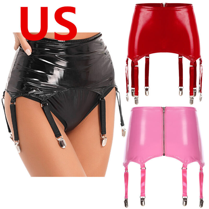 Wet look patent leather garters with metal clips keeps stockings from slipping.