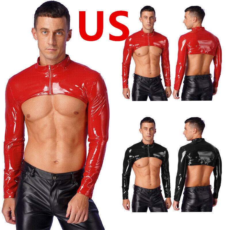 Men crop top adopts patent leather, and designs with stand collar and front zipper, long sleeve, which looks cool and chic.