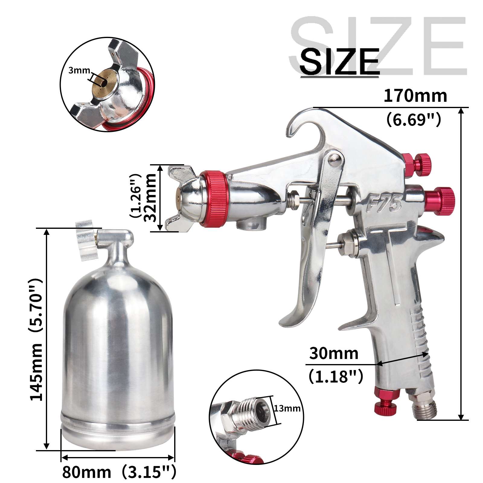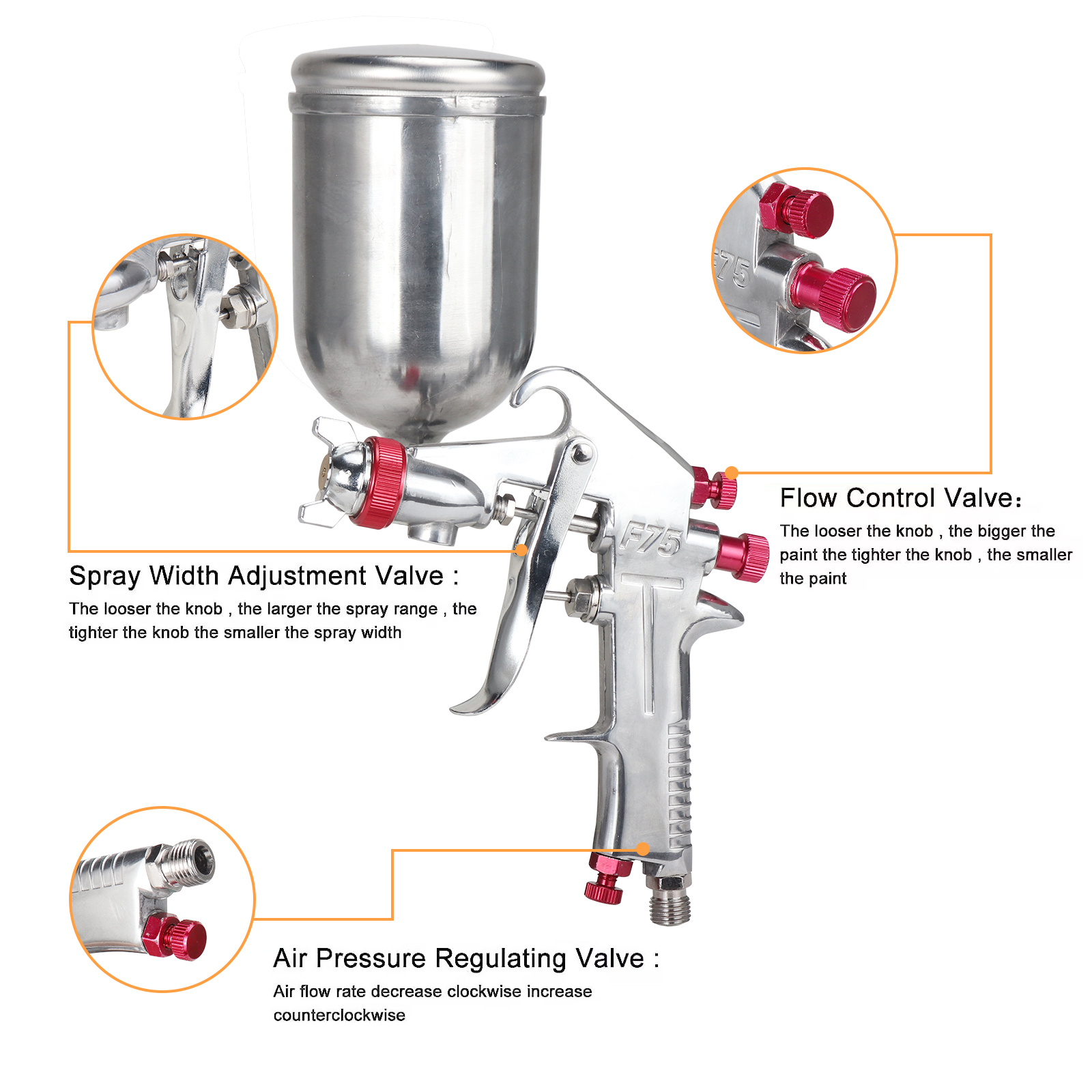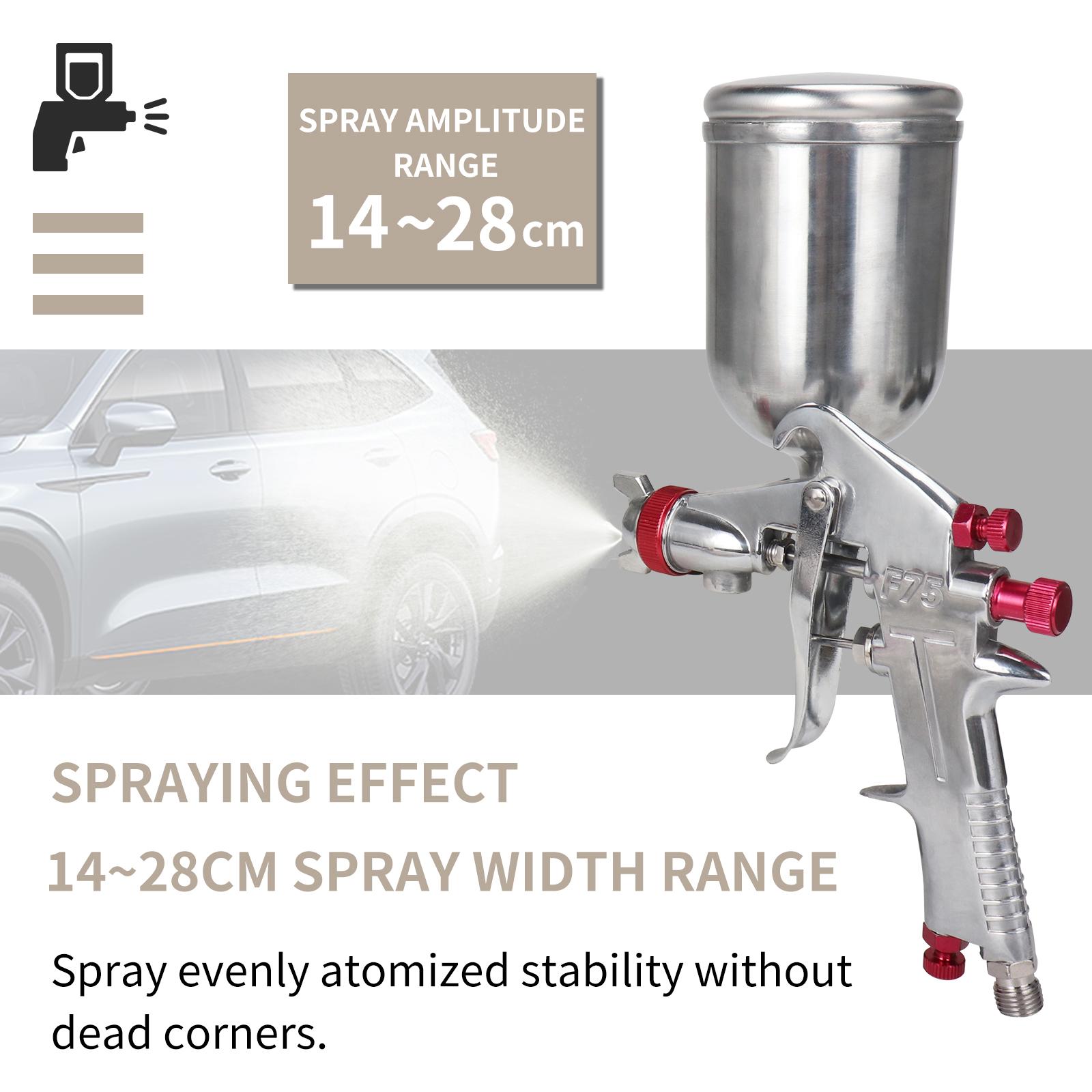 Product Include: HVLP paint spray gun(model: F-75G), a 400cc(400ml) aluminum cup, a cleaning brush.