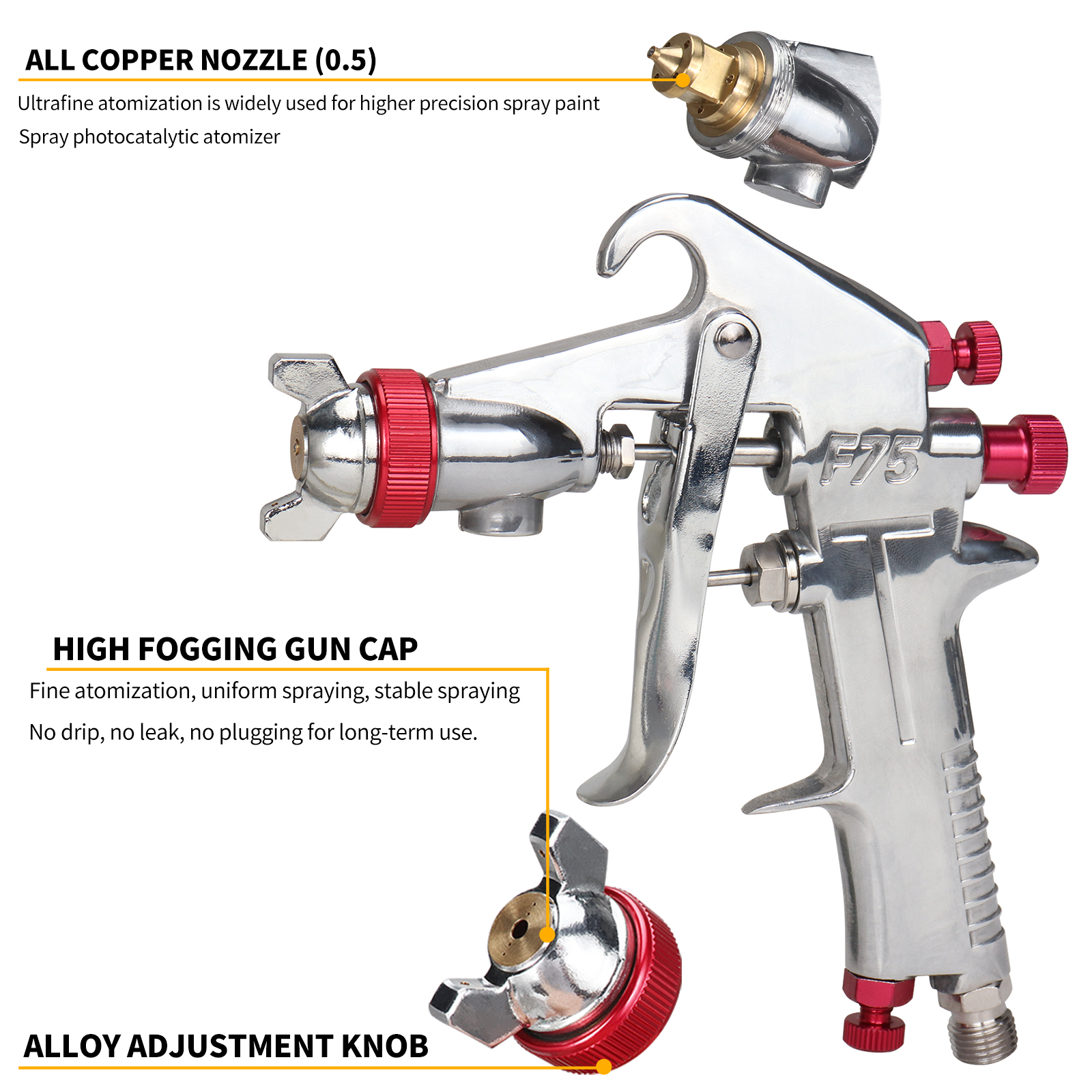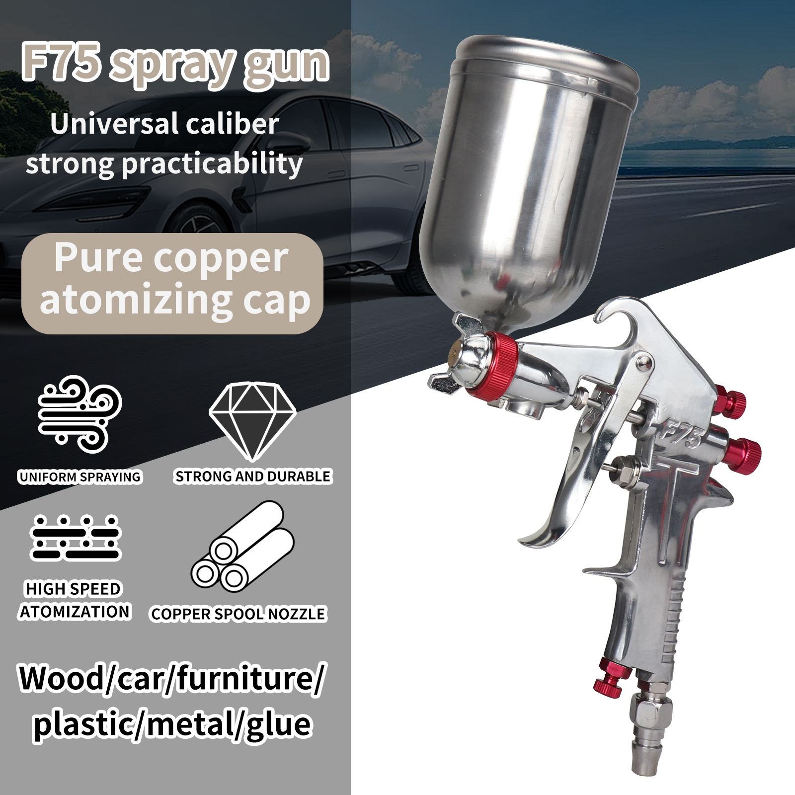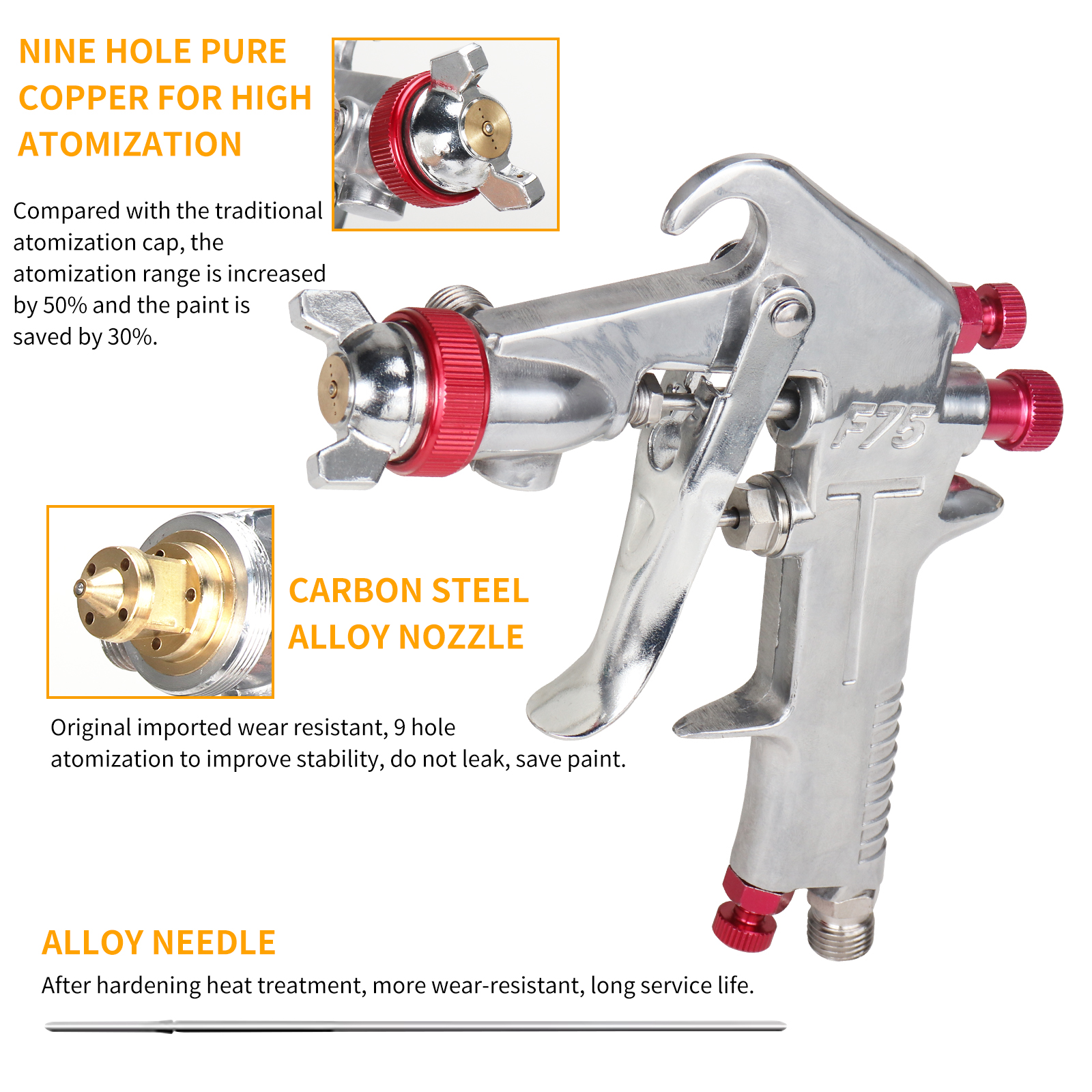 Product Include: HVLP paint spray gun(model: F-75G), a 400cc(400ml) aluminum cup, a cleaning brush.