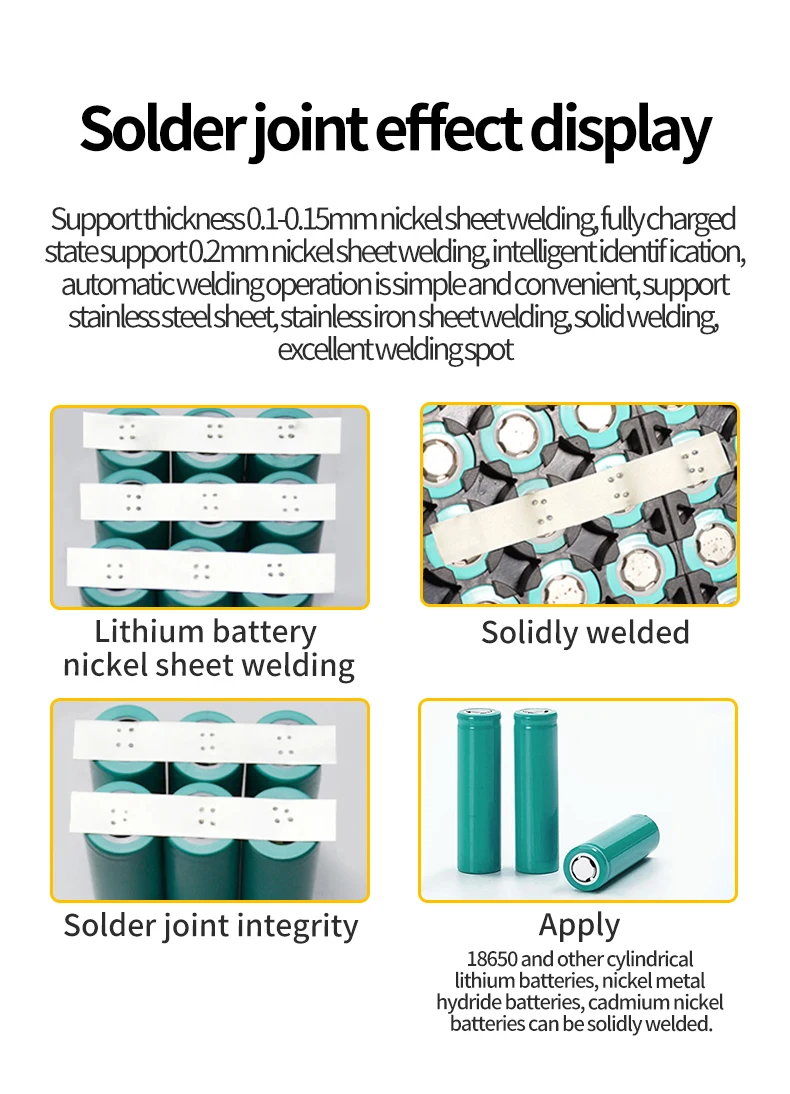 Recommended Working Power Source: This product can be widely used on spots welding cylindrical lithium batteries, nickel metal hydride batteries, and nickel-cadmium batteries, such as 18650/26650/32650, etc.