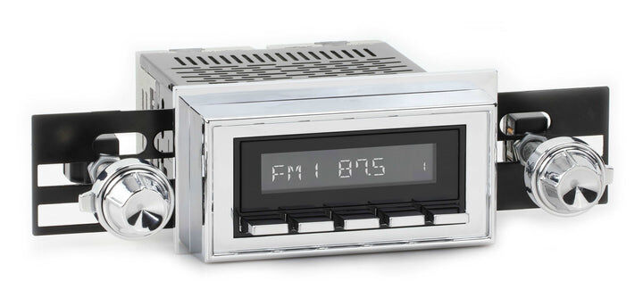 The RetroSound® RetroRadio® is our most versatile Radio Face, designed after traditional 2-shaft radios with classic push-buttons found in thousands of makes & models from the 40s-80s. Combined with hundreds of faceplates, bezels, and replica knobs, the RetroRadio is the most authentic solution for adding modern audio to classic cars and trucks. The RetroRadio is available in black or chrome, with the choice of black, chrome, or ivory push-buttons.