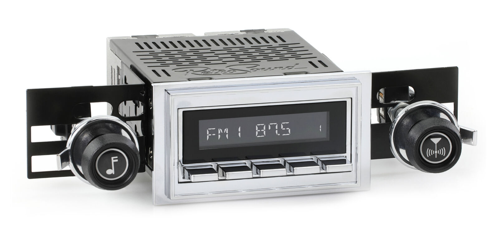 The RetroSound® RetroRadio® is our most versatile Radio Face, designed after traditional 2-shaft radios with classic push-buttons found in thousands of makes & models from the 40s-80s. Combined with hundreds of faceplates, bezels, and replica knobs, the RetroRadio is the most authentic solution for adding modern audio to classic cars and trucks. The RetroRadio is available in black or chrome, with the choice of black, chrome, or ivory push-buttons.