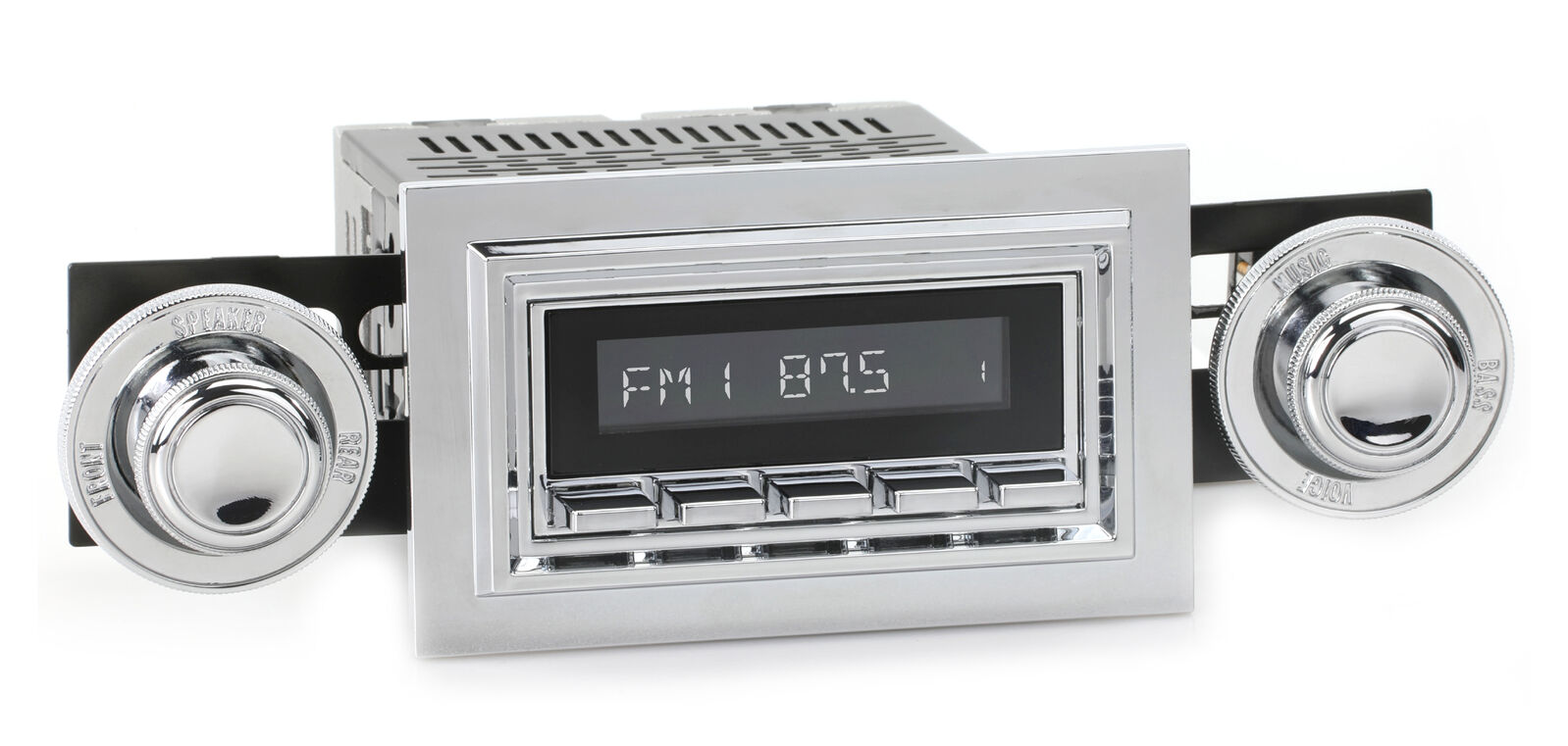 The RetroSound® RetroRadio® is our most versatile Radio Face, designed after traditional 2-shaft radios with classic push-buttons found in thousands of makes & models from the 40s-80s. Combined with hundreds of faceplates, bezels, and replica knobs, the RetroRadio is the most authentic solution for adding modern audio to classic cars and trucks. The RetroRadio is available in black or chrome, with the choice of black, chrome, or ivory push-buttons.