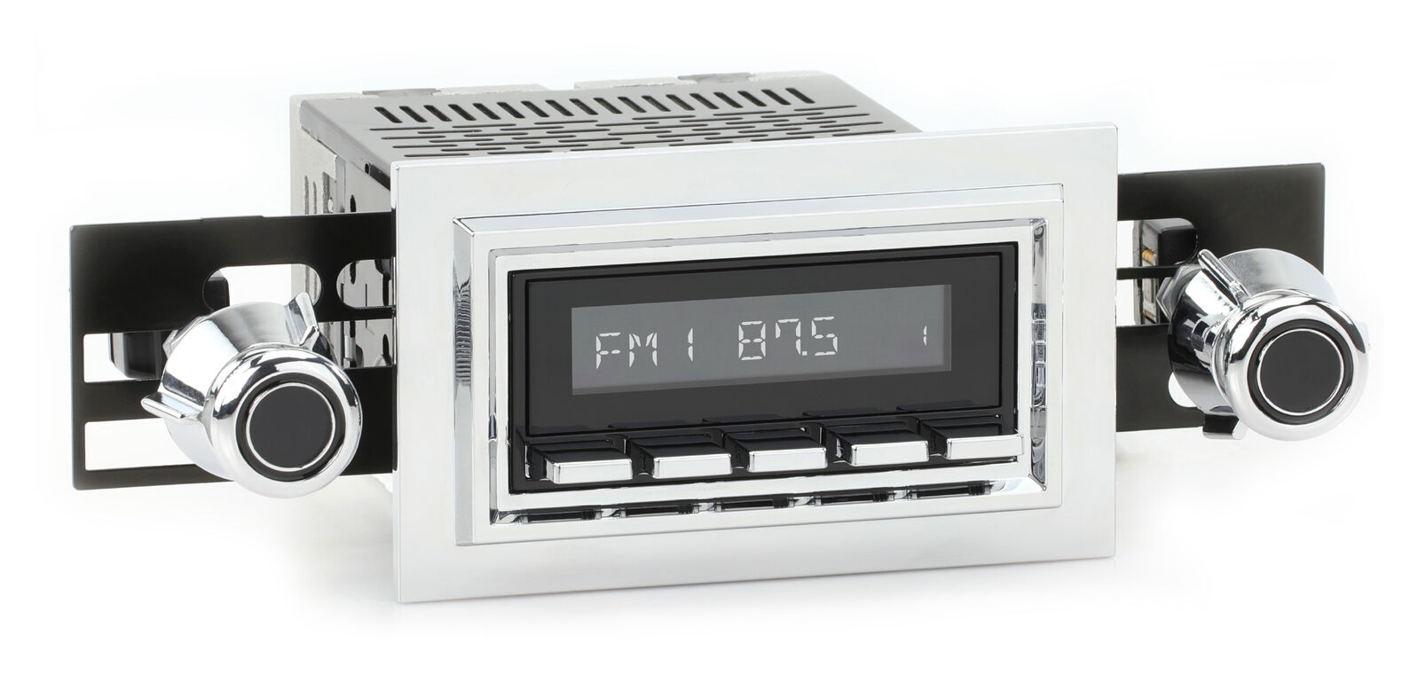The RetroSound® RetroRadio® is our most versatile Radio Face, designed after traditional 2-shaft radios with classic push-buttons found in thousands of makes & models from the 40s-80s. Combined with hundreds of faceplates, bezels, and replica knobs, the RetroRadio is the most authentic solution for adding modern audio to classic cars and trucks. The RetroRadio is available in black or chrome, with the choice of black, chrome, or ivory push-buttons.