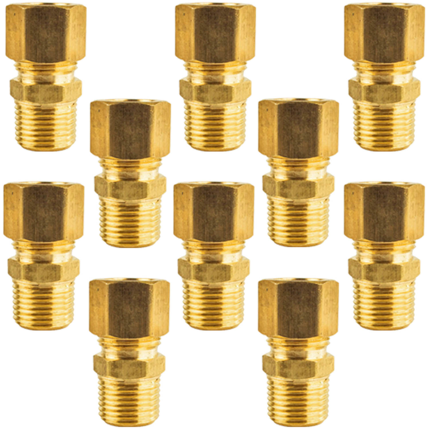 10 pack of 3/8" male NPT by 1/2" compression straight pipe connectors. This fitting connects 1/2" OD brass, bronze, copper, steel, aluminum or iron pipes to a 3/8" female NPT outlet or fitting in a straight line.