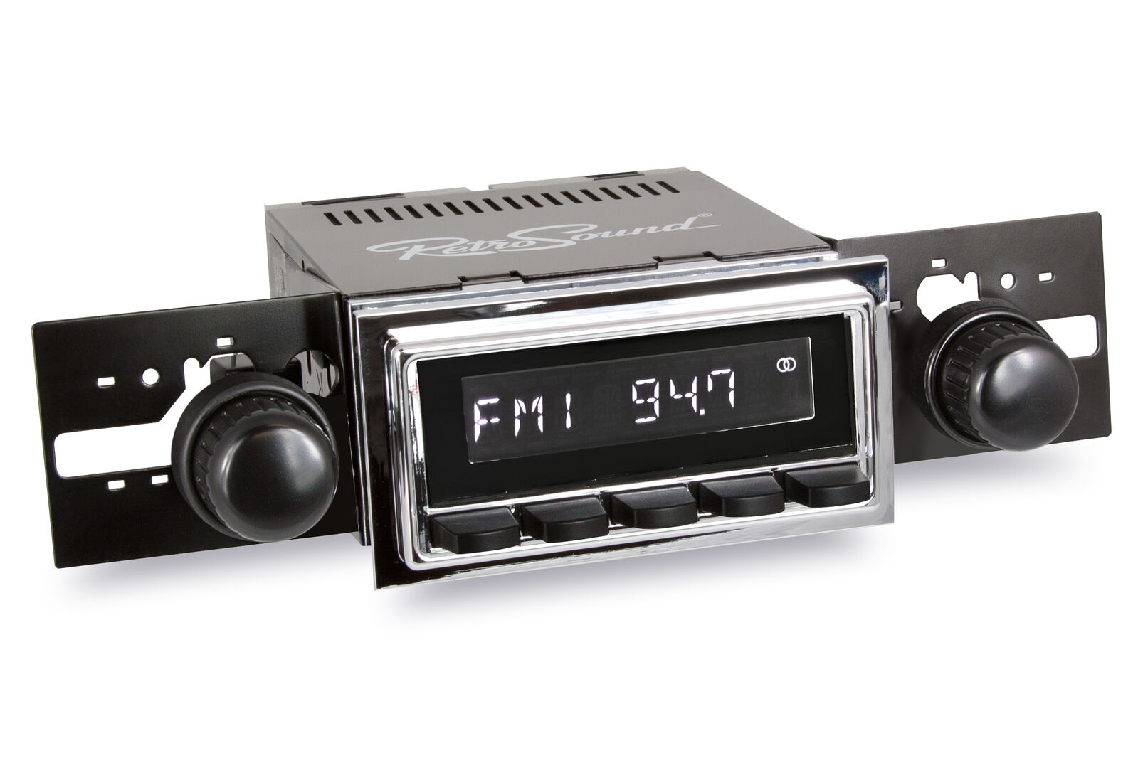 The RetroSound® RetroRadio® is our most versatile Radio Face, designed after traditional 2-shaft radios with classic push-buttons found in thousands of makes & models from the 40s-80s. Combined with hundreds of faceplates, bezels, and replica knobs, the RetroRadio is the most authentic solution for adding modern audio to classic cars and trucks. The RetroRadio is available in black or chrome, with the choice of black, chrome, or ivory push-buttons.