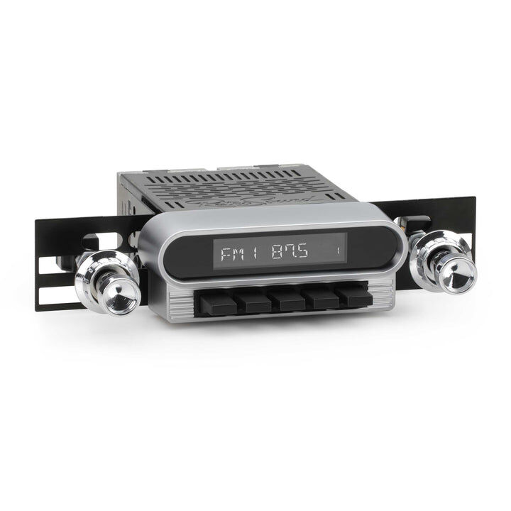 The RetroSound® RetroRadio® is our most versatile Radio Face, designed after traditional 2-shaft radios with classic push-buttons found in thousands of makes & models from the 40s-80s. Combined with hundreds of faceplates, bezels, and replica knobs, the RetroRadio is the most authentic solution for adding modern audio to classic cars and trucks. The RetroRadio is available in black or chrome, with the choice of black, chrome, or ivory push-buttons.