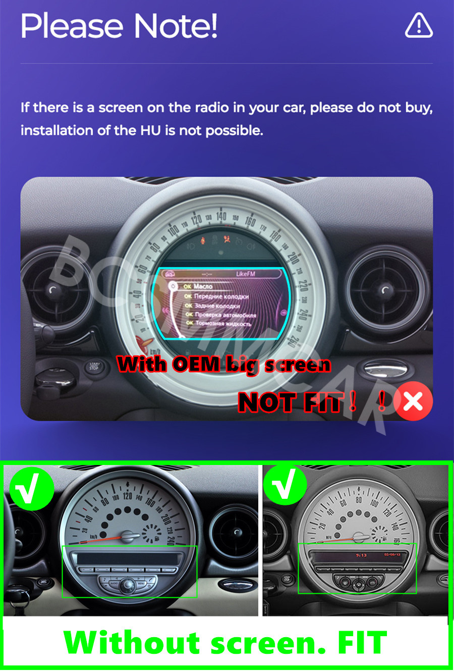 2. If your car has an original large screen, will not fit.(As picture show)
