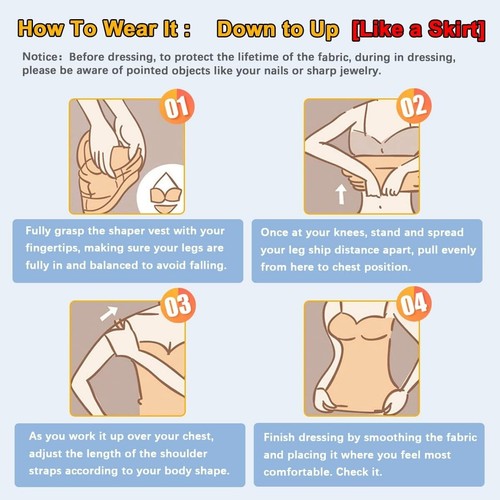 【THE CORRECT WAY TO WEAR】Womens camisole tank tops should always be put on feet first and then gently tugged up to the chest. Please refer to the images for more details.Don't pull it in from the top down, you'll find it hard to stretch and need to be pulled into place from the bottom up( like a skirt).