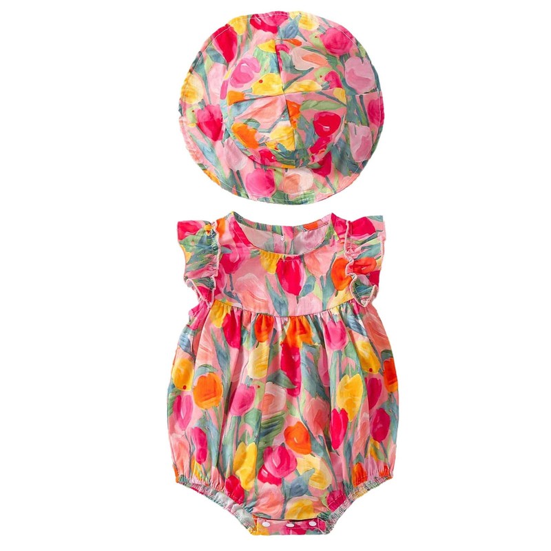 The romper has a round collar and fly sleeves design, adding a touch of cuteness and elegance, following the current trendy baby fashion style.