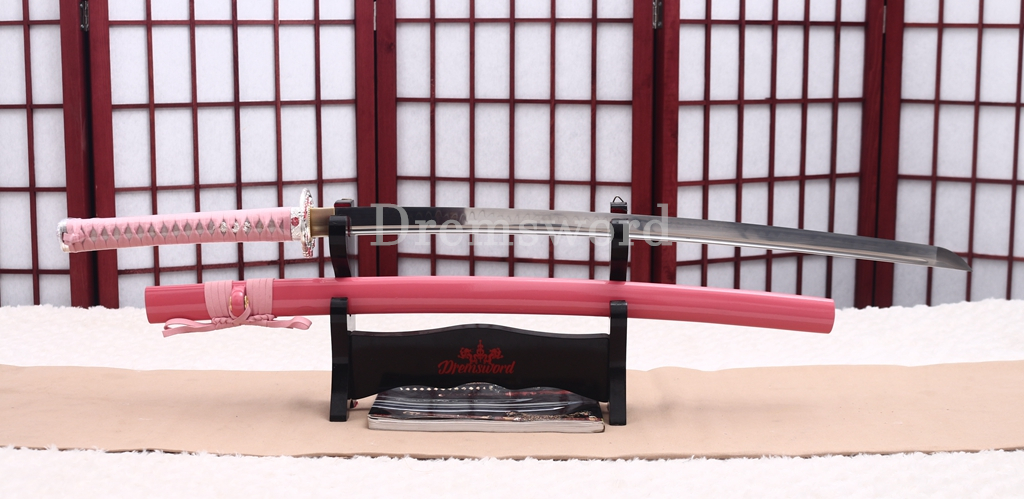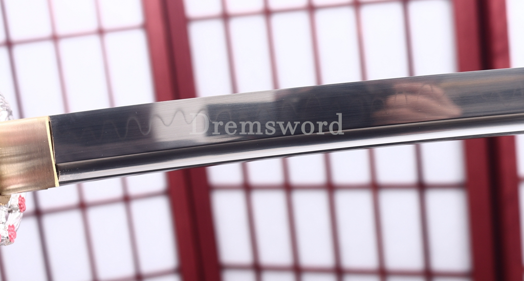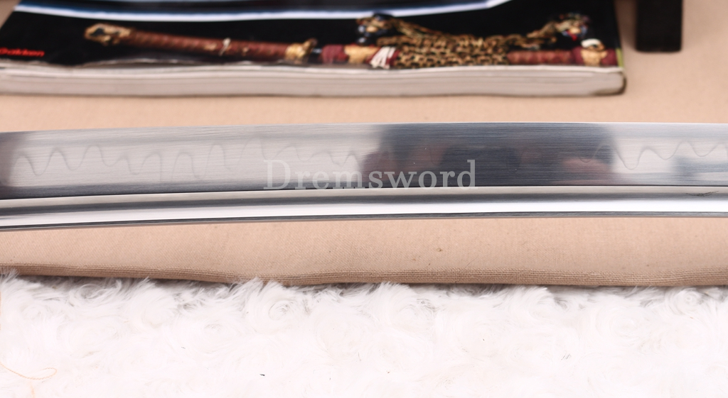 The balde was made of L6 steel in Maru structure. It was fully hand forged, hand shaping, hand polishing in the most traditional method of sword making. A special clay was applied on the blade to control the rate at which the blades cools when quenced after grinding(rough finishing). The clay ensures carbon does not simply escape during this process. What's more,we are applying different thicknesses of clay to the edge and spine(back) of the blade respectively(Differential hardening), a beautiful real hamon was appeared result of Differential hardening. It was well heat treating (Refining) and quenching(Tempering) greatly improve the hardness and flexibility of the balde for real use. The blade has shaped in "SHINOGI-ZUKURI" style. There is Bo-Hi to keep good on balance. The sword is sharp enough for cutting pratice, very good choice for Dojo students and collection, gifts and display. It is durable enough for cutting tameshigiri and bamboo.
