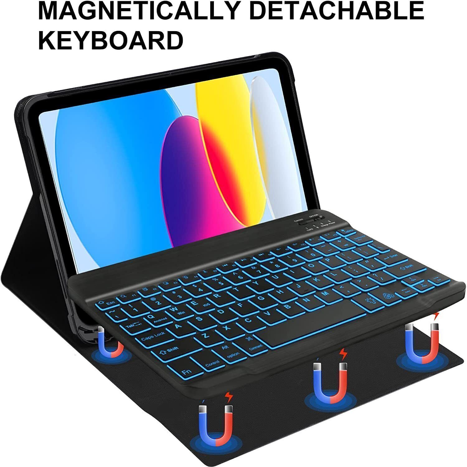 【Detachable & Backlit Bluetooth Keyboard】- 3 levels of brightness and 7 vibrant backlight colors make typing fun and easy in the dark or the light.The ipad 10th generation keyboard can be attached to the case magnetically, if not needed, it can be removed.Bluetooth connectivity is easy.