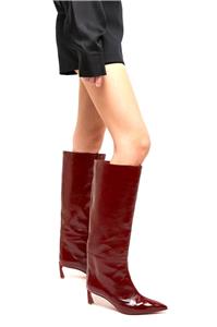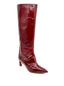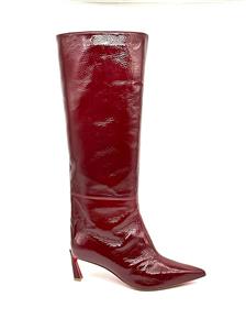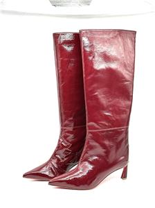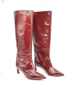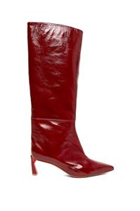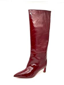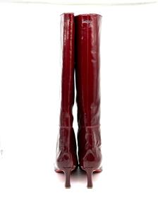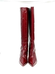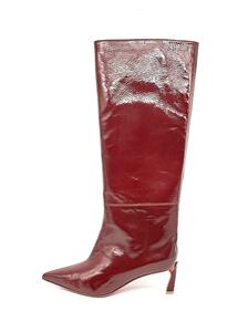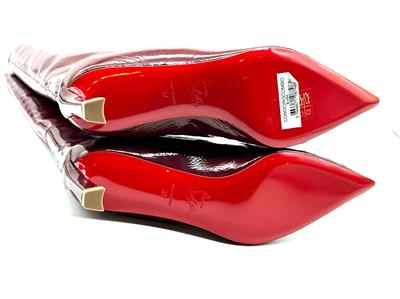 These Christian Louboutin knee-high boots are crafted in patent-leather with a crinkle-effect and paneled design. These pull-on boots feature a signature red sole and a pointed toe. The heel measures approximately 2.5 inches/ 55mm.