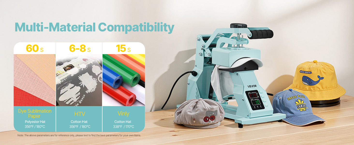 Our heat press for hats provides precise temperature (33.8℉–450℉) and time (up to 999 s) controls for optimal printing on various materials. Multiple hat platens are included for sublimation paper, polyester, cotton, etc. It is ideal for both beginners and professionals, ensuring easy use.