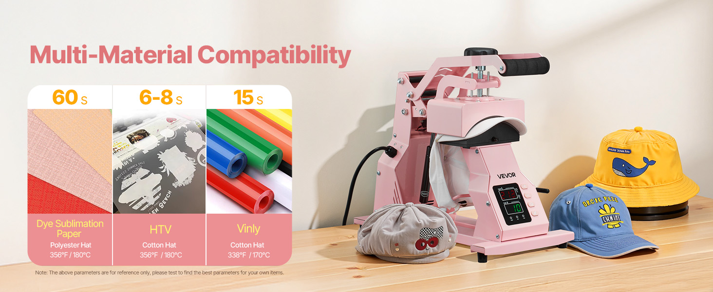 Our heat press for hats provides precise temperature (33.8℉–450℉) and time (up to 999 s) controls for optimal printing on various materials. Multiple hat platens are included for sublimation paper, polyester, cotton, etc. It is ideal for both beginners and professionals, ensuring easy use.