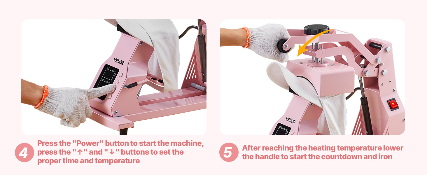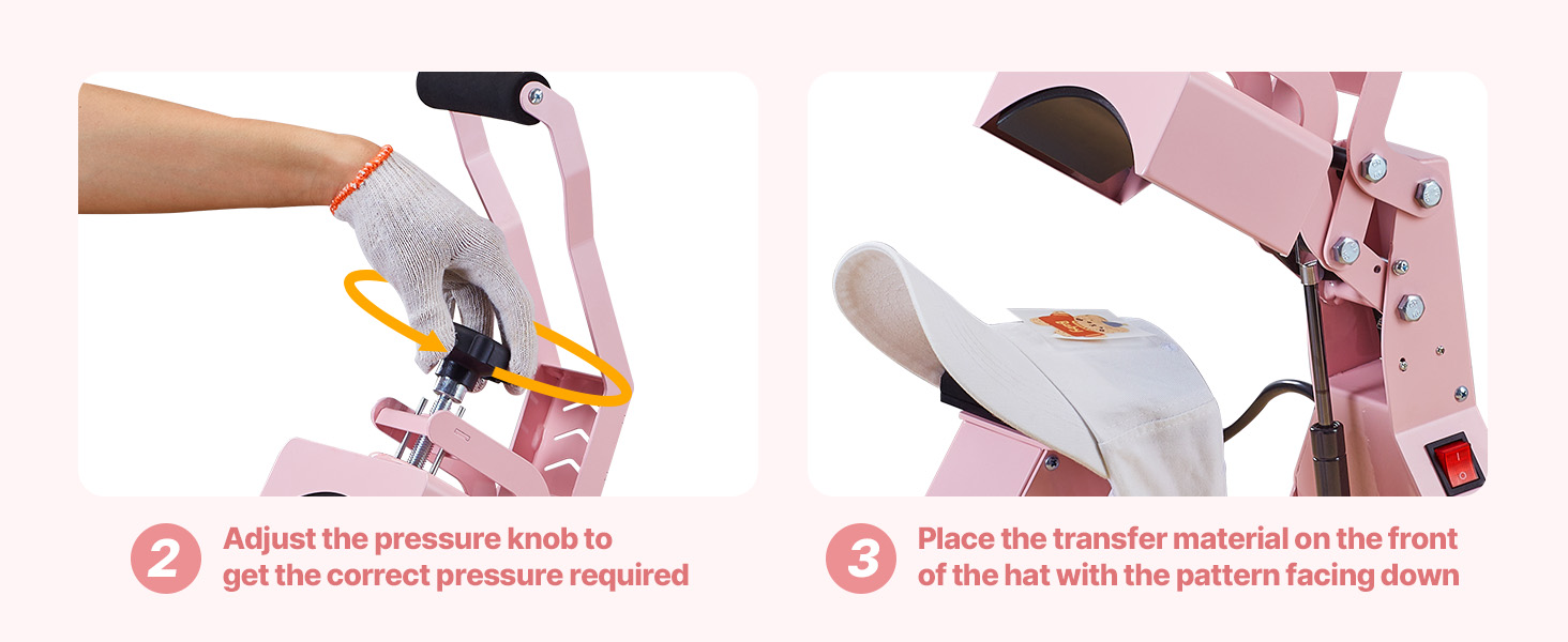 - Easy Operation: The heat press for hats features an ergonomic long-arm handle for smooth pressing. The pressure knob adjusts to material thickness. Flip design with auto shut-off adds security. Engineered to exceed industry standards for easy use