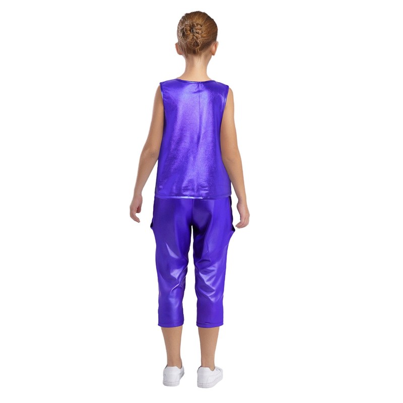 The round-neck sleeveless metallic vest top is a trendy and eye-catching piece, adding a touch of glamour and reflecting the latest fashion trends in dance wear.