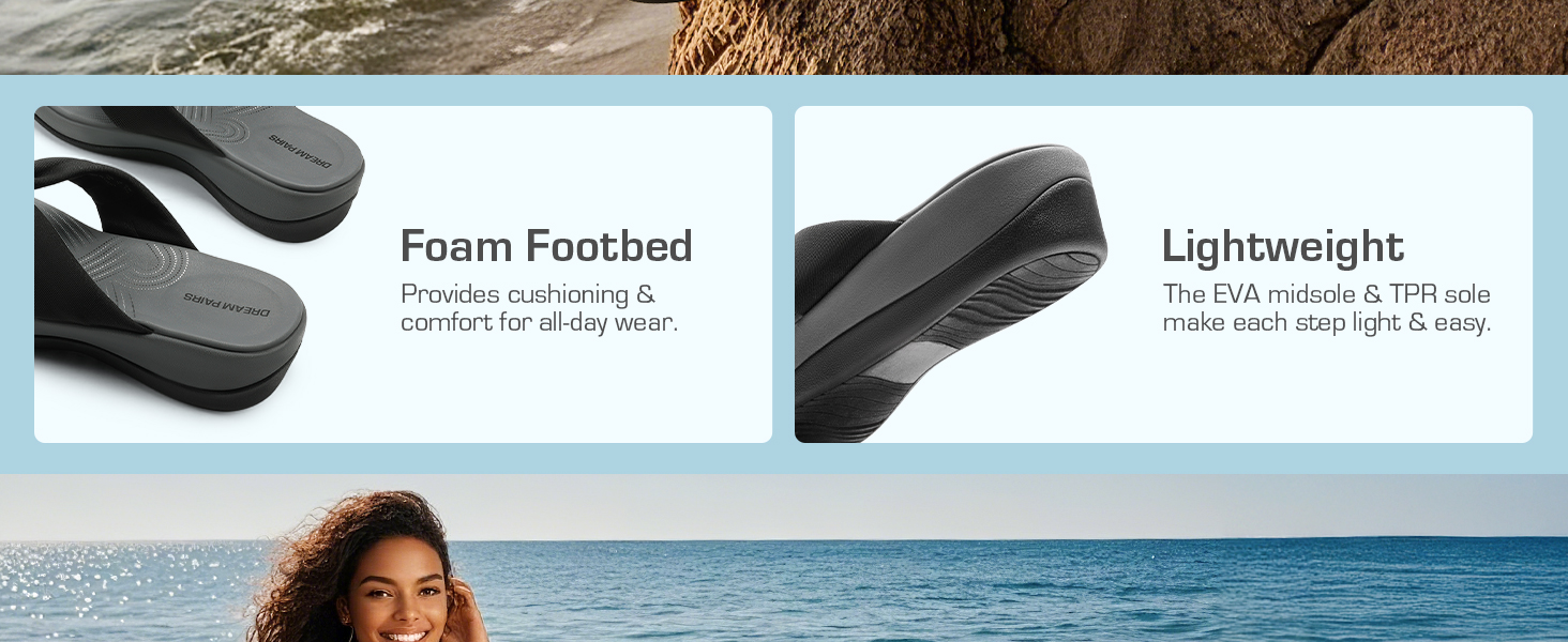 • Comfortable Fit: Soft EVA foam footbed with arch support for all-day comfort.