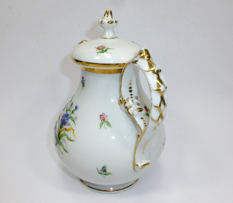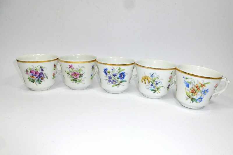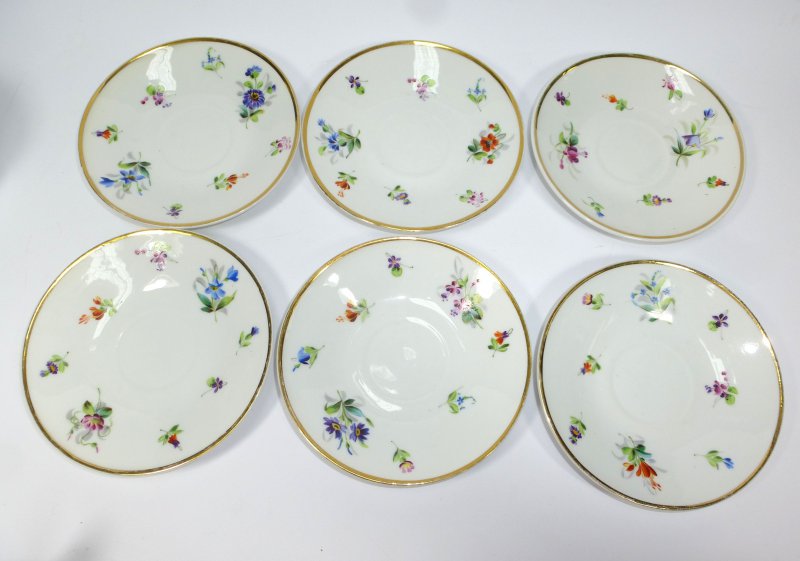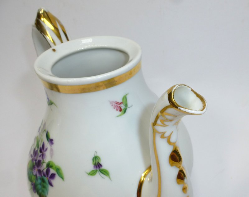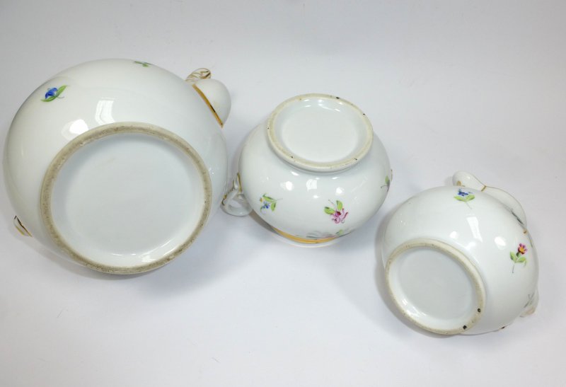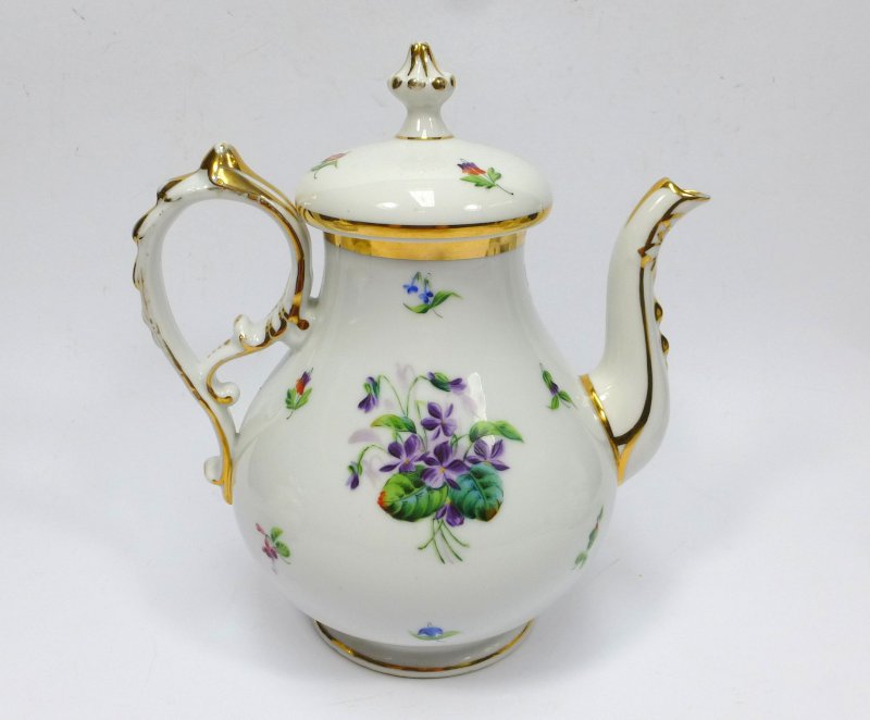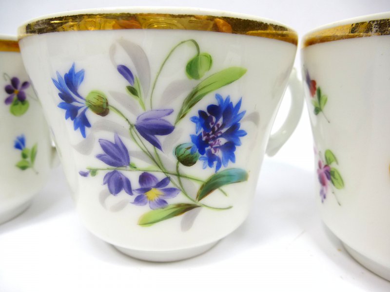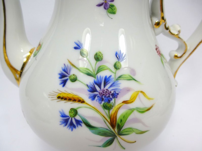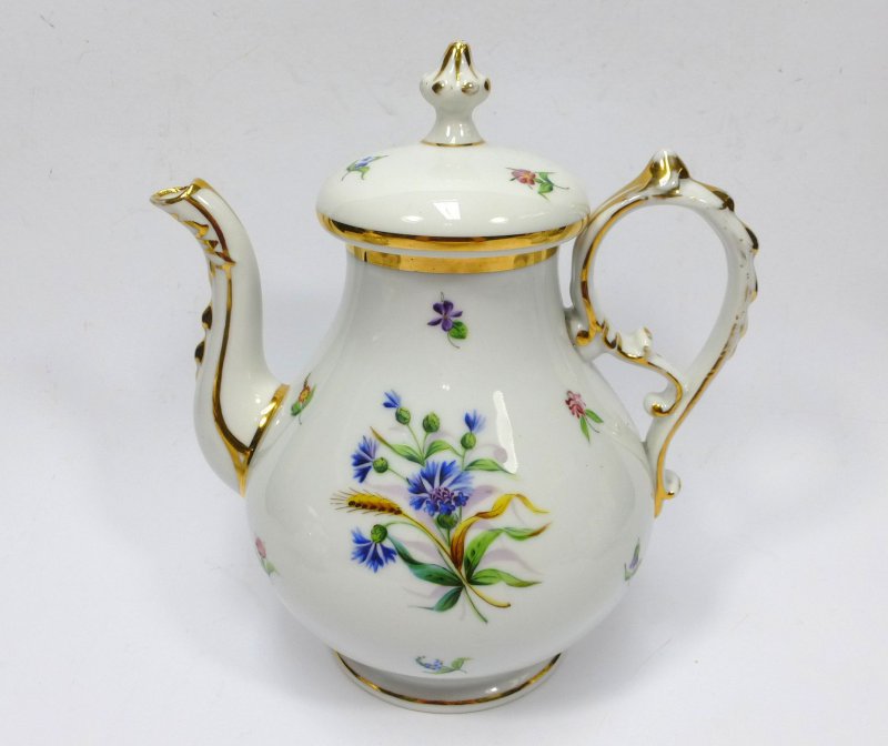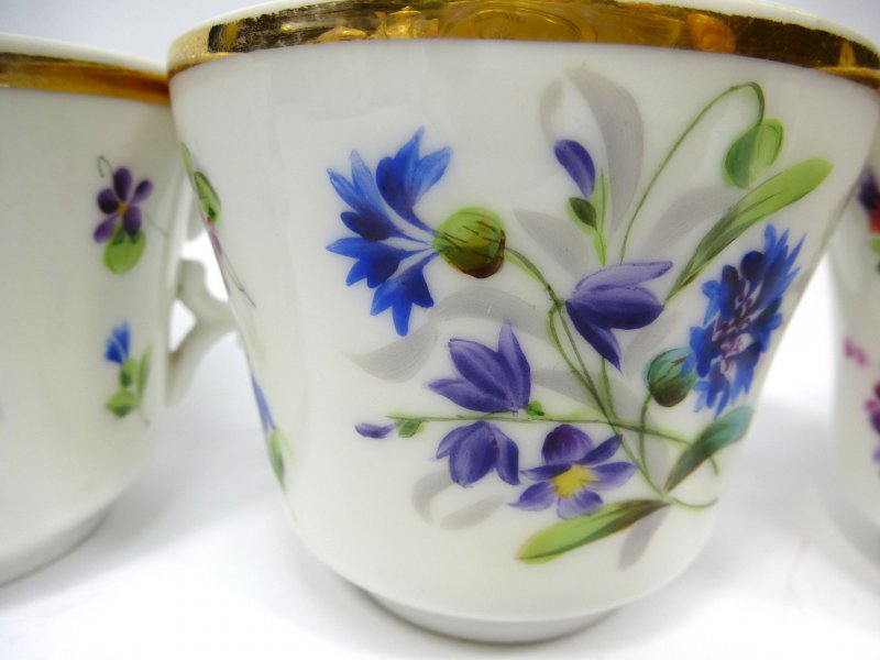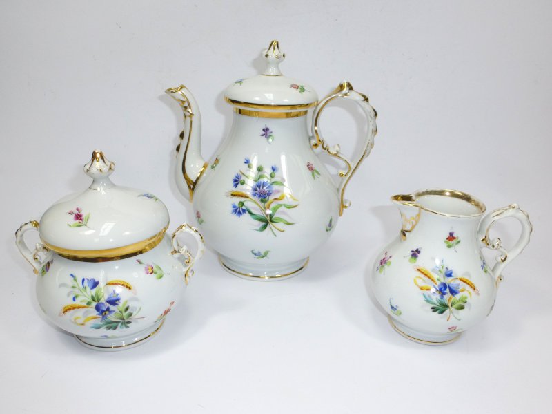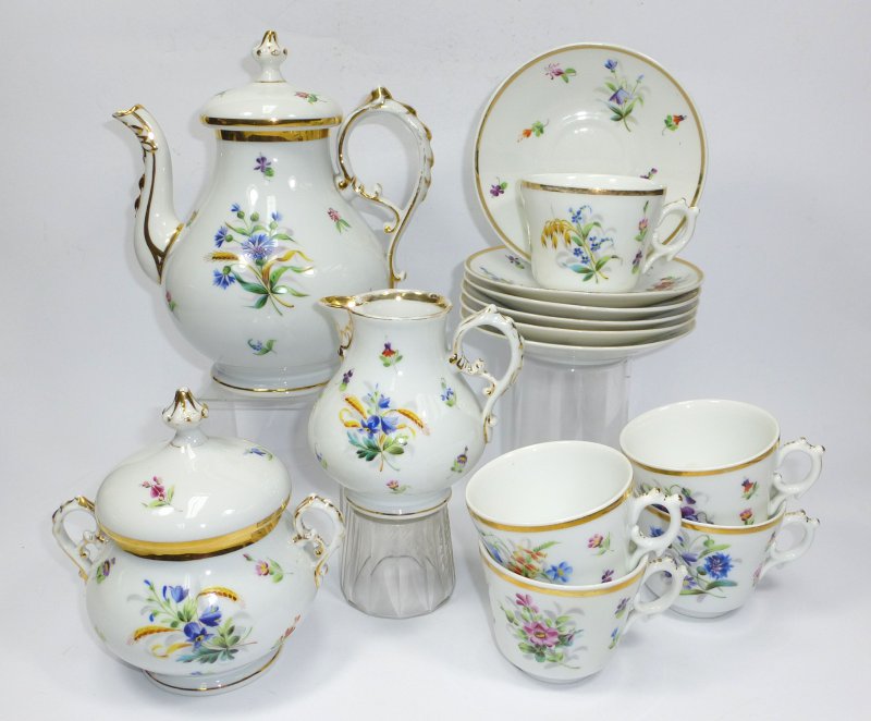 Tee-Service, Schlesien, Mitte / Ende XIX Jh. Porzellan handbemalt. Maße ca.: Kanne - 22,3 x 20 x 14,5 cm. Milchkännchen - 11,5 x 11,4 x 9 cm. Zuckerdose - 14,5 x 14,5 x 11 cm. Tassen - 10 x 8 x 6,7 cm. Untertassen - 14,1 x 2,3 cm. Gesamtgewicht: 2 811 Gramm. Guter gebrauchter Zustand, altersbedingte Gebrauchsspuren, eine Tasse fehlt (siehe Fotos)