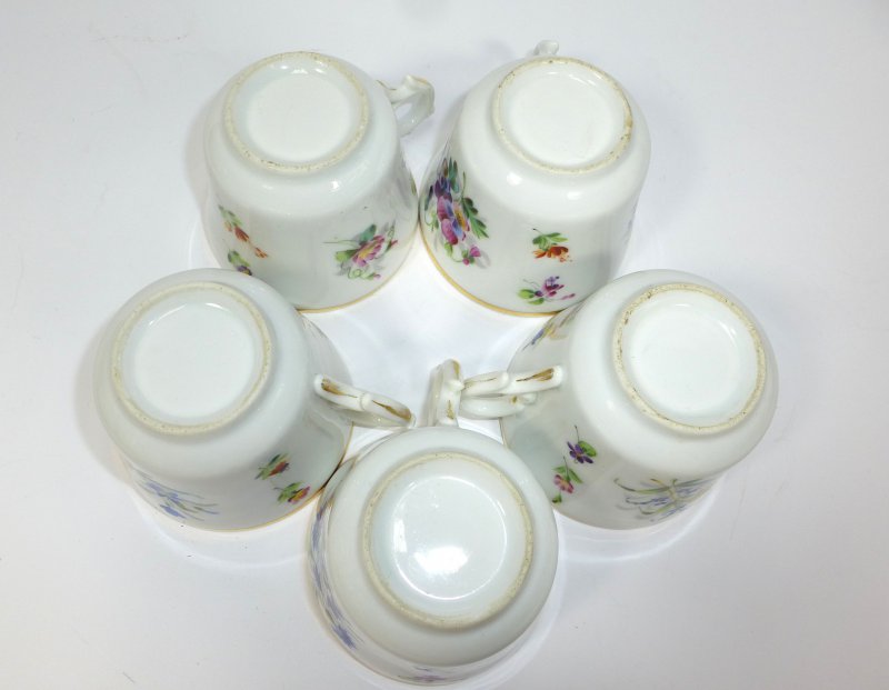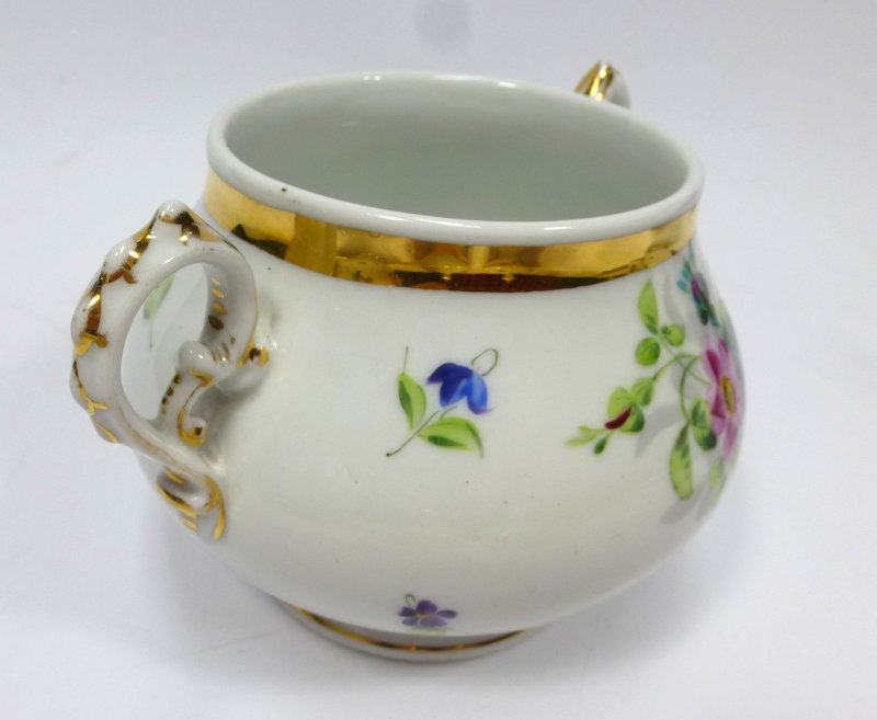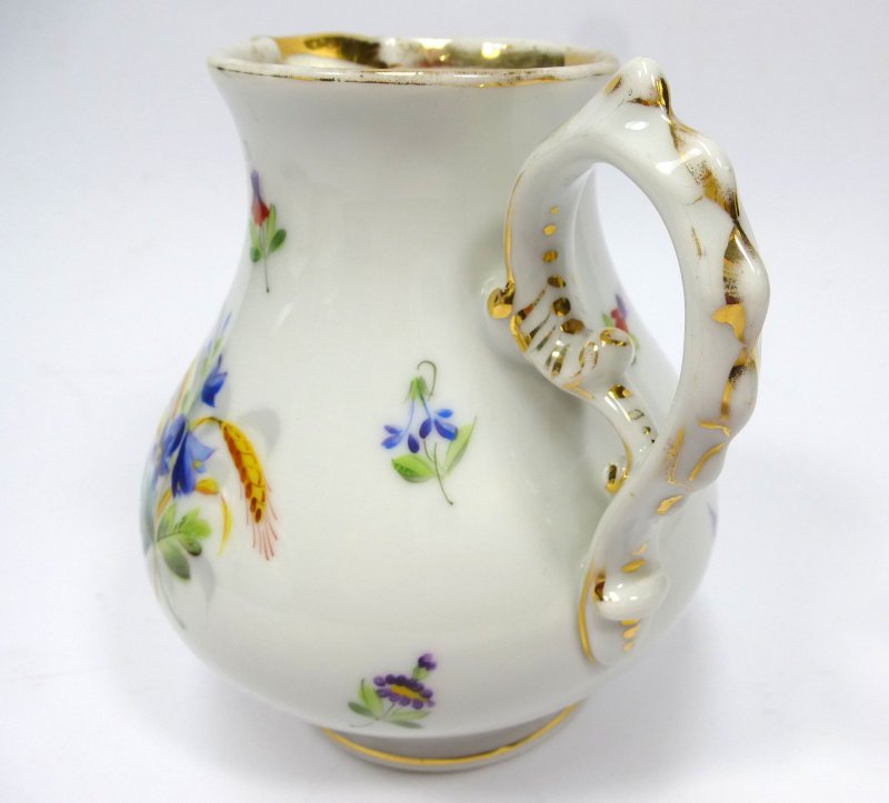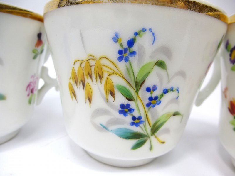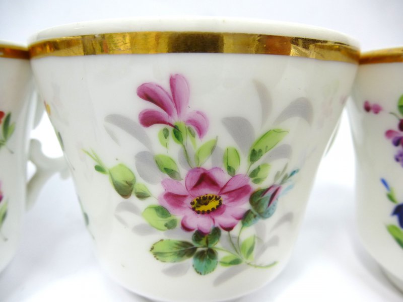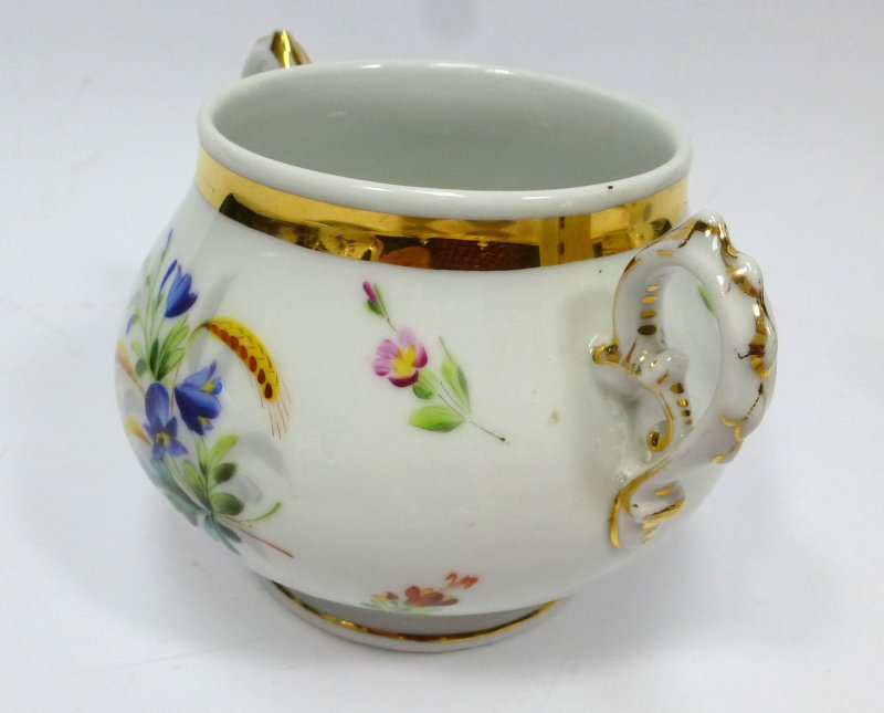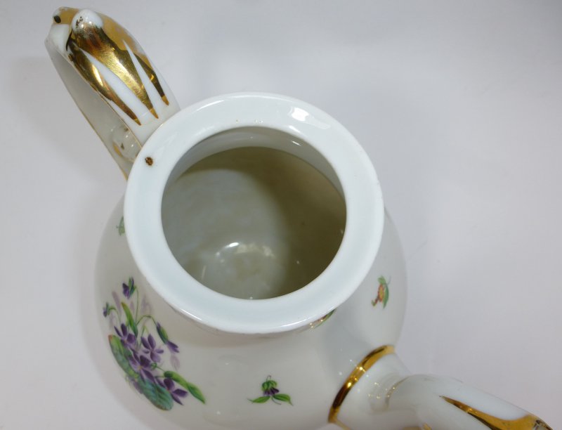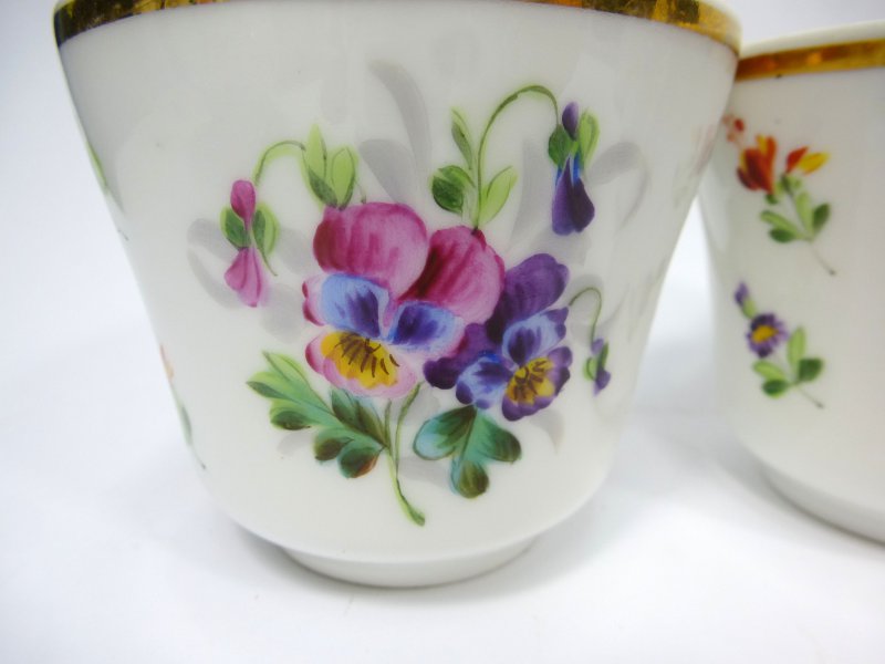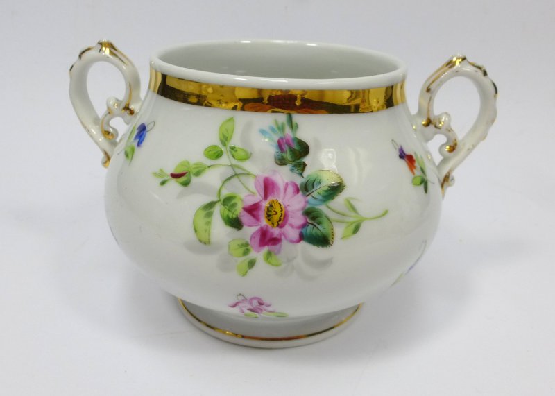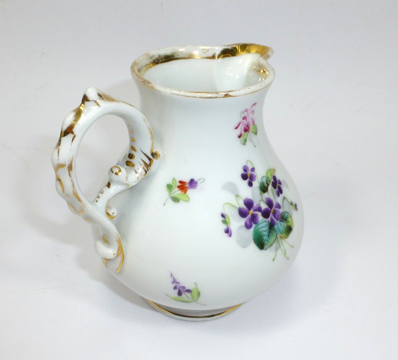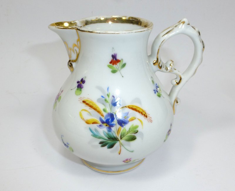 Tee-Service, Schlesien, Mitte / Ende XIX Jh. Porzellan handbemalt. Maße ca.: Kanne - 22,3 x 20 x 14,5 cm. Milchkännchen - 11,5 x 11,4 x 9 cm. Zuckerdose - 14,5 x 14,5 x 11 cm. Tassen - 10 x 8 x 6,7 cm. Untertassen - 14,1 x 2,3 cm. Gesamtgewicht: 2 811 Gramm. Guter gebrauchter Zustand, altersbedingte Gebrauchsspuren, eine Tasse fehlt (siehe Fotos)