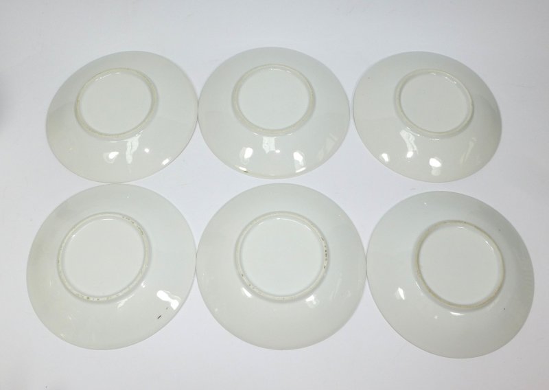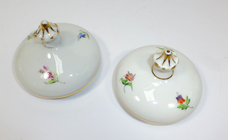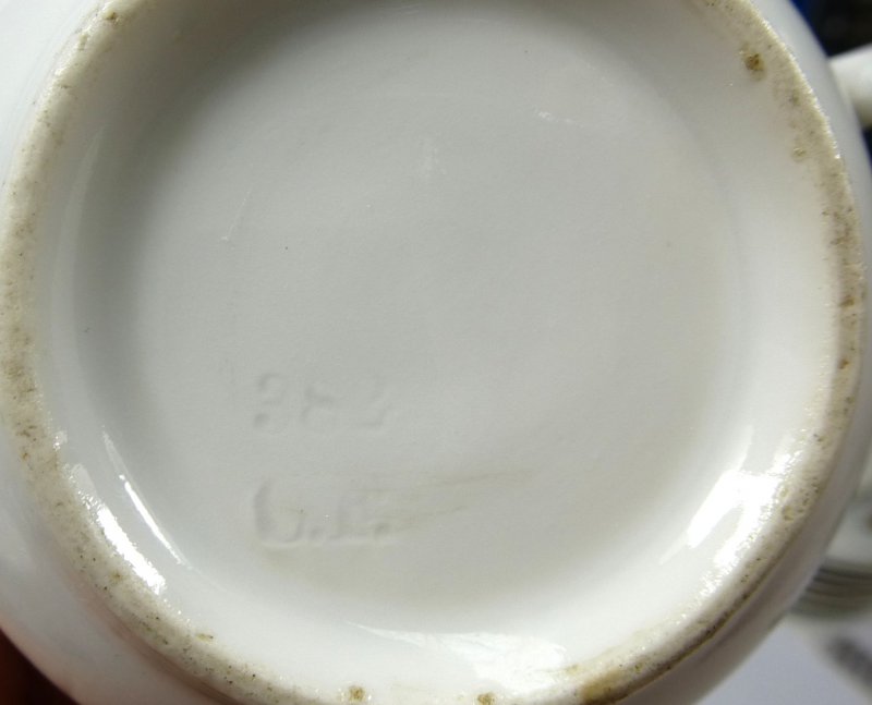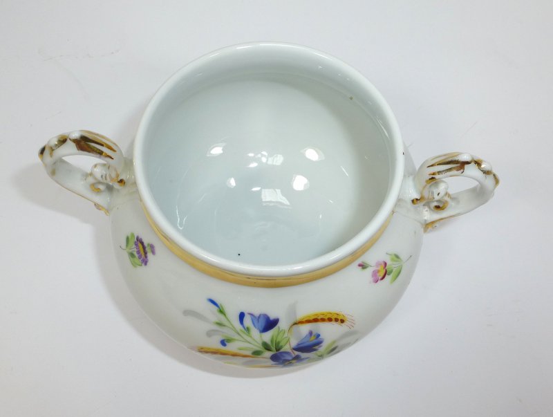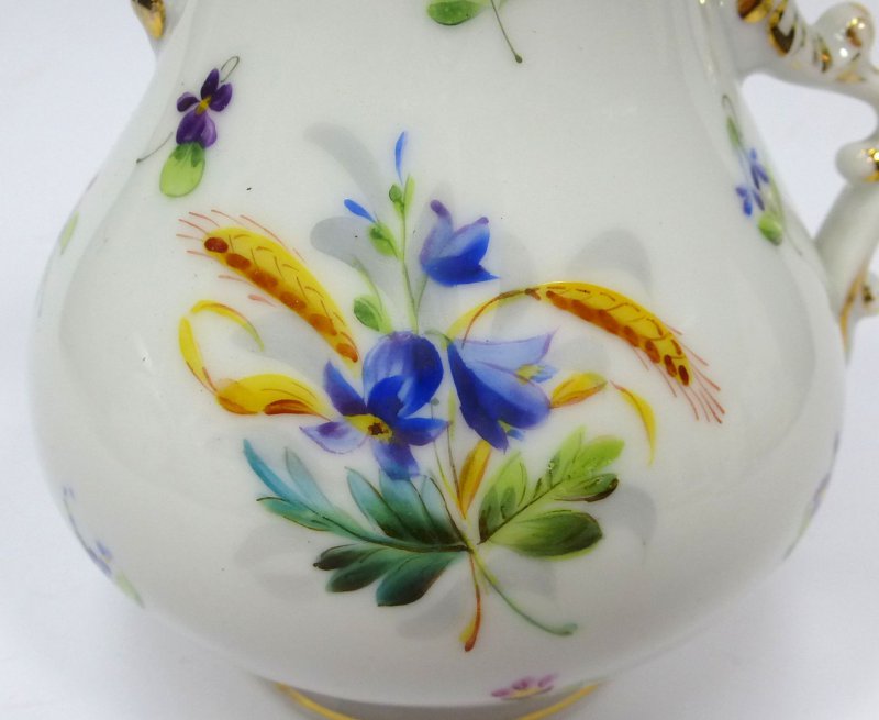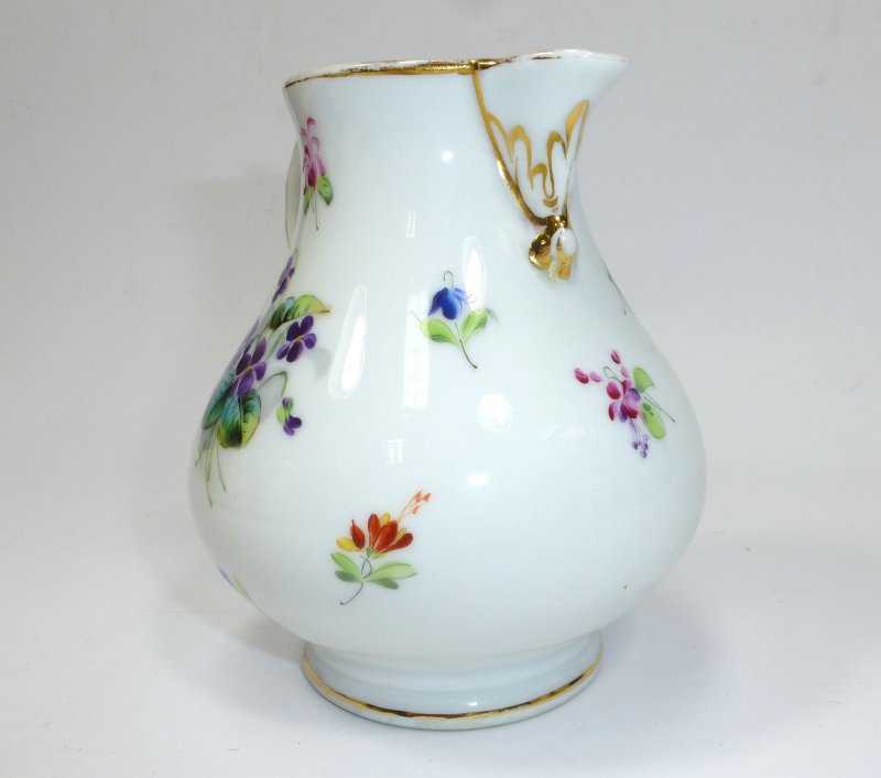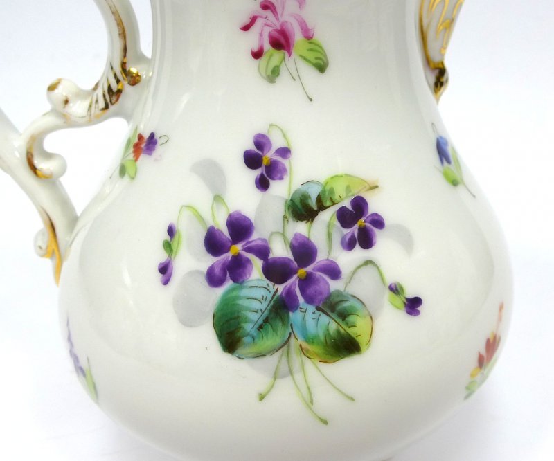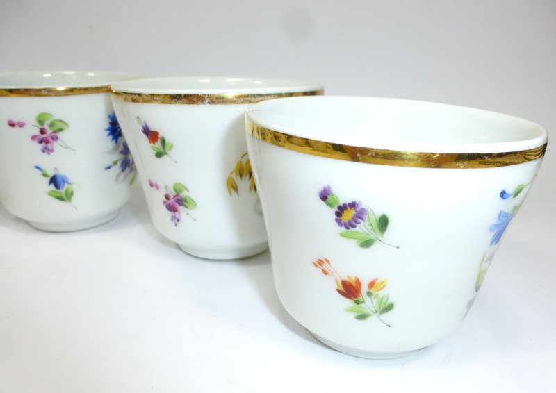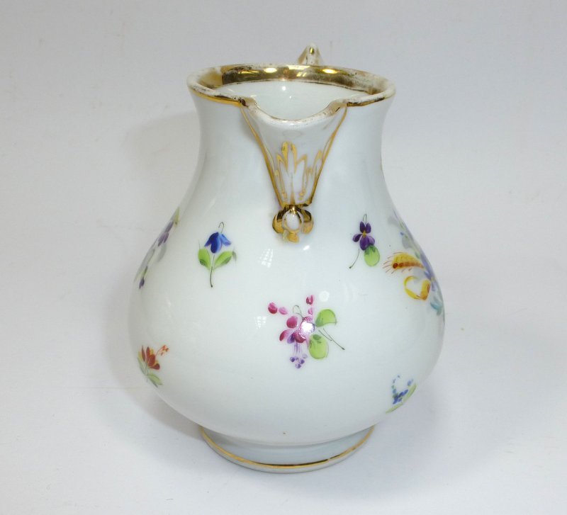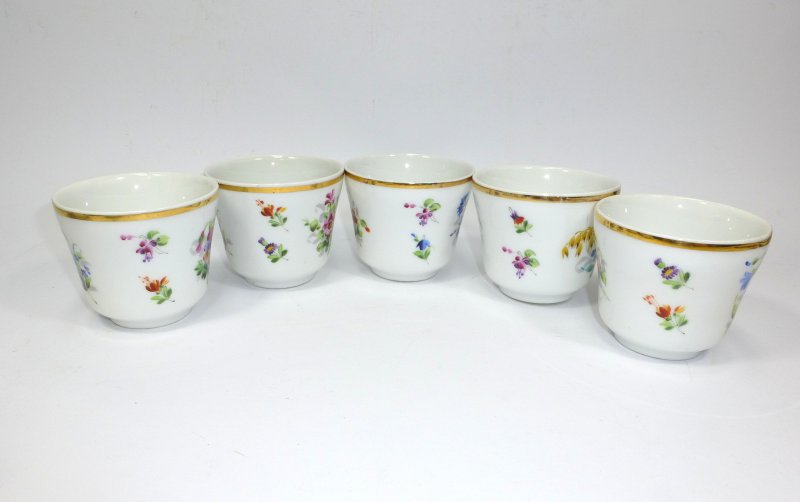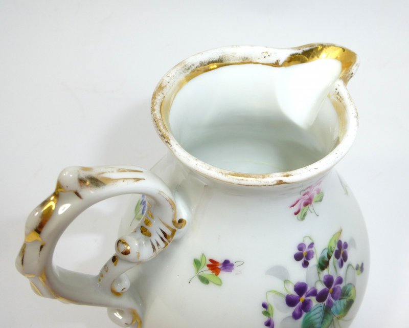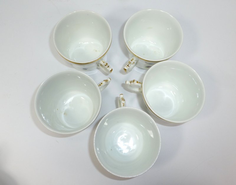 Tee-Service, Schlesien, Mitte / Ende XIX Jh. Porzellan handbemalt. Maße ca.: Kanne - 22,3 x 20 x 14,5 cm. Milchkännchen - 11,5 x 11,4 x 9 cm. Zuckerdose - 14,5 x 14,5 x 11 cm. Tassen - 10 x 8 x 6,7 cm. Untertassen - 14,1 x 2,3 cm. Gesamtgewicht: 2 811 Gramm. Guter gebrauchter Zustand, altersbedingte Gebrauchsspuren, eine Tasse fehlt (siehe Fotos)