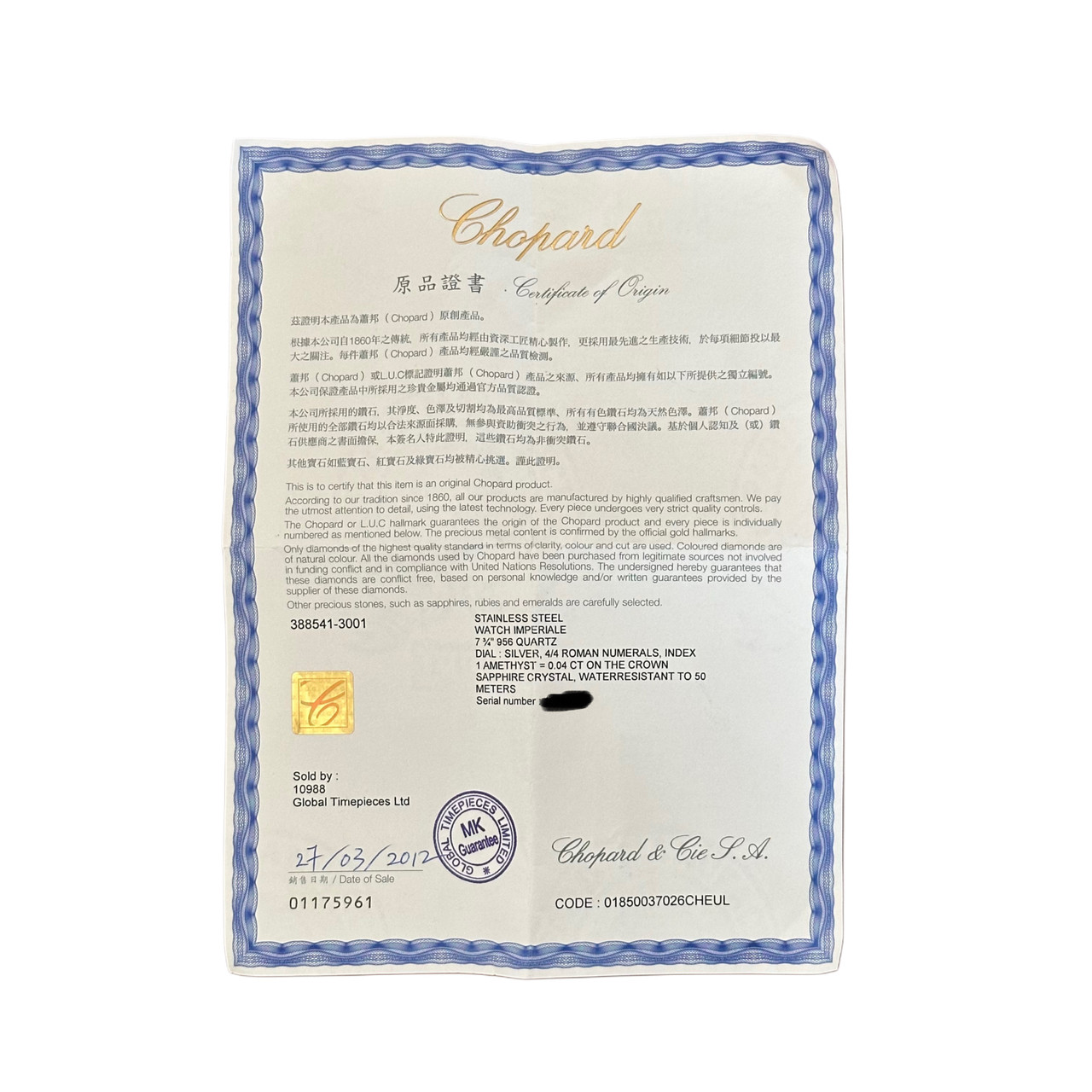 Brand: ChopardModel Name: ImperialeReference: 388541-3001Condition: Pre-Owned. Very Good Condition. Shows light signs of wear and swirls.Strap: Alligator - UsedCase Size: 28mmCase Metal: Stainless SteelMovement: QuartzFunctions: Date, TimeBox and Papers: Yes. Papers Only.*CERTIFIED 100% AUTHENTIC - ALL WATCHES ARE GUARANTEED TO BE 100% AUTHENTIC.Inventory Number: 7610